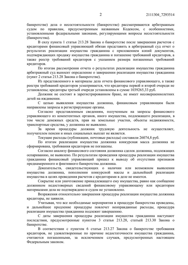 Не найдя оснований для дальнейшего продления процедуры реализации имущества, суд вынес определение о ее завершении. Такое решение позволило нашему клиенту начать новую финансовую жизнь, свободную от непосильных долгов.