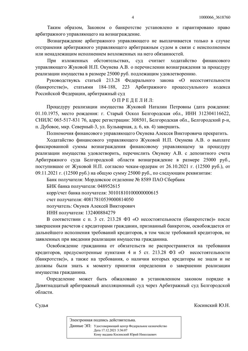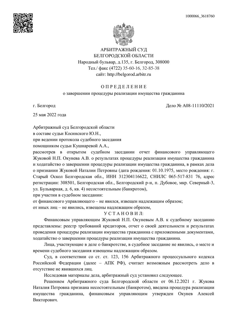 Еще один клиент компании "ДОЛГАМ.НЕТ" успешно прошел процедуру банкротства. Арбитражный суд Белгородской области вынес определение по делу №А08-11110/2021 и освободил гражданина от всех долговых обязательств.