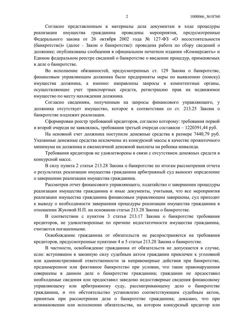 Наш клиент имел задолженности в размере 1 220 391 рубль, которые не удалось погасить. В ходе процедуры были опубликованы все необходимые сообщения в официальных изданиях и проведен сбор сведений о должнике. Денежные средства, поступившие на счёт в размере 7 440 рублей, были исключены из конкурсной массы, так как они предназначались для выплаты прожиточного минимума.
