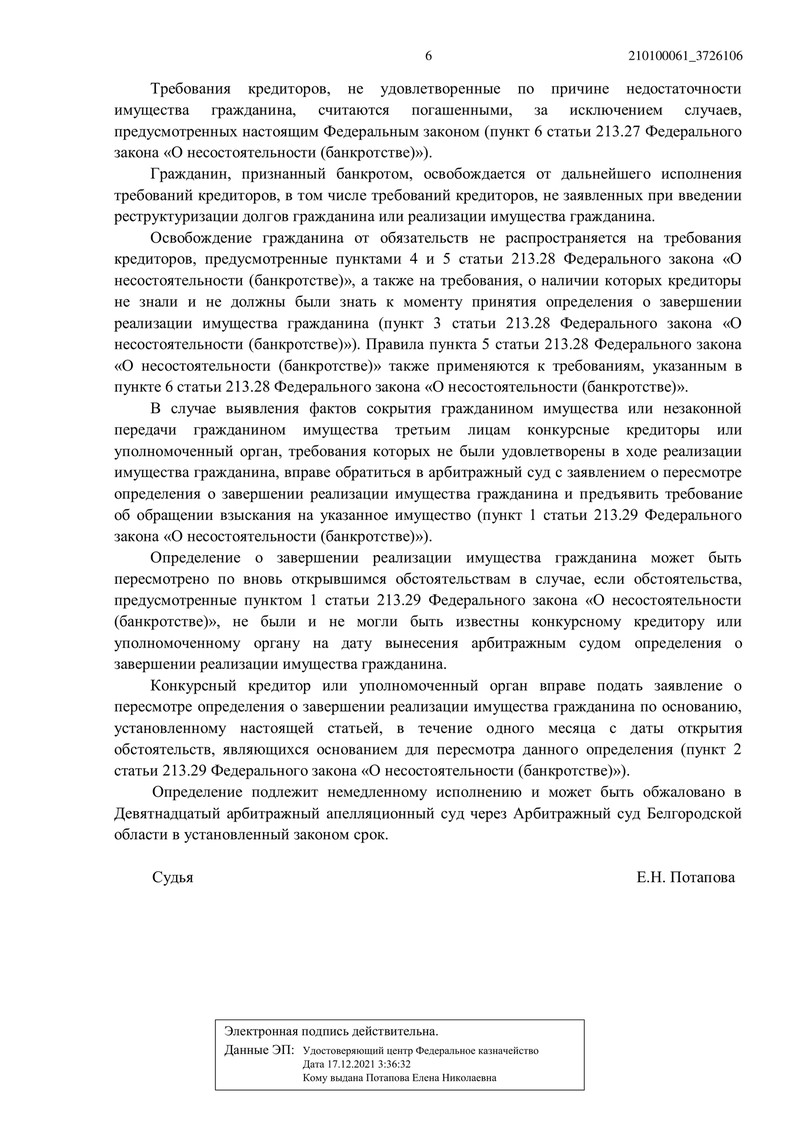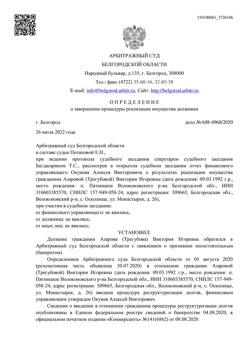 Арбитражный суд Белгородской области принял решение завершить процедуру реализации имущества клиента компании "ДОЛГАМ.НЕТ". Дело под номером А08-4968/2020 стало очередным успехом в копилке нашей компании, которая помогает своим клиентам избавиться от долгов и начать жизнь с чистого листа.