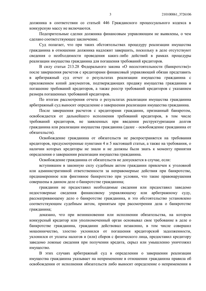 Финансовый управляющий успешно провел все необходимые мероприятия для выявления имущества должника и формирования конкурсной массы. Однако ценных активов для погашения долгов перед кредиторами не было обнаружено. Требования кредиторов не удалось погасить в полном объеме. Однако наш клиент был освобожден от дальнейшего их исполнения, как это и предусмотрено Федеральным законом №127-ФЗ "О несостоятельности (банкротстве)".