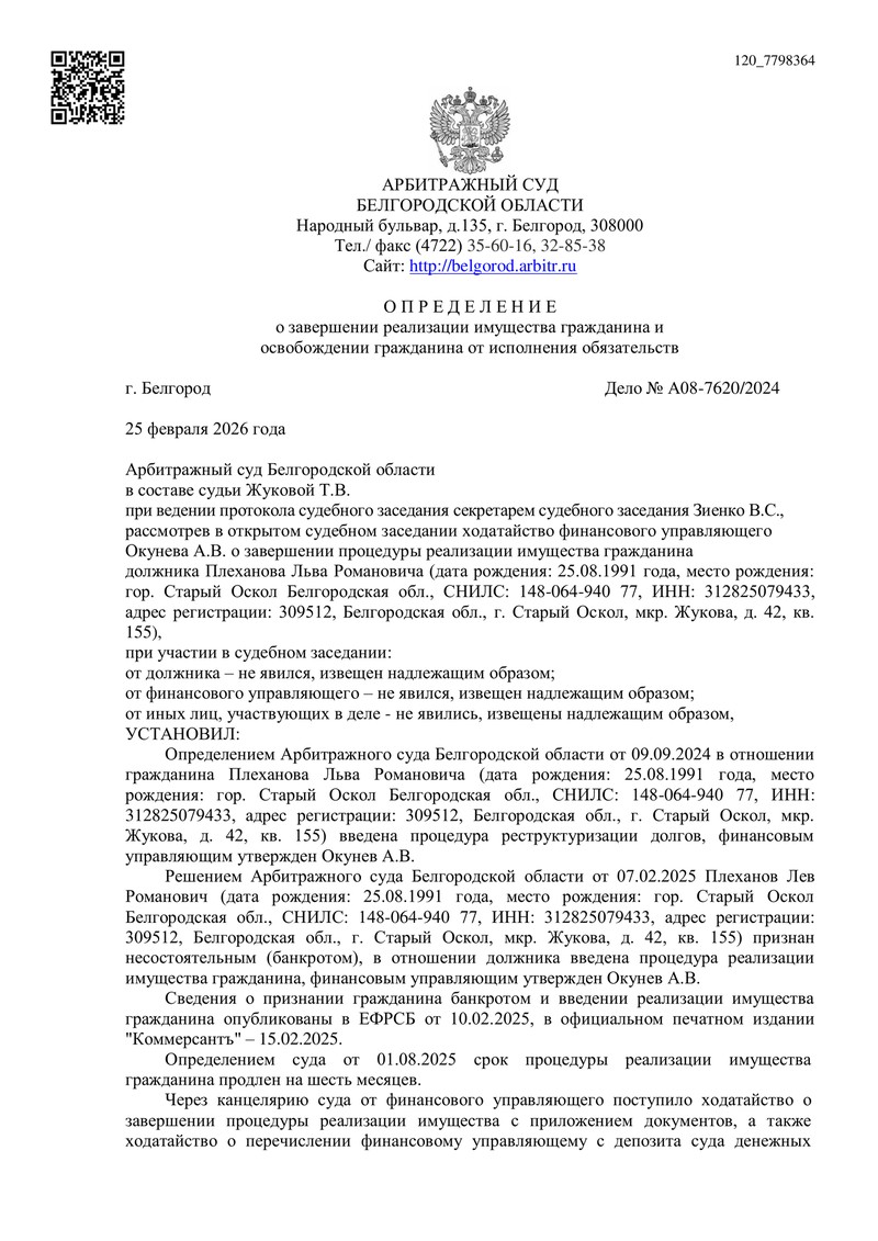 Дело № А08-7620/2024 — завершение банкротства и списание долгов в Белгородской области