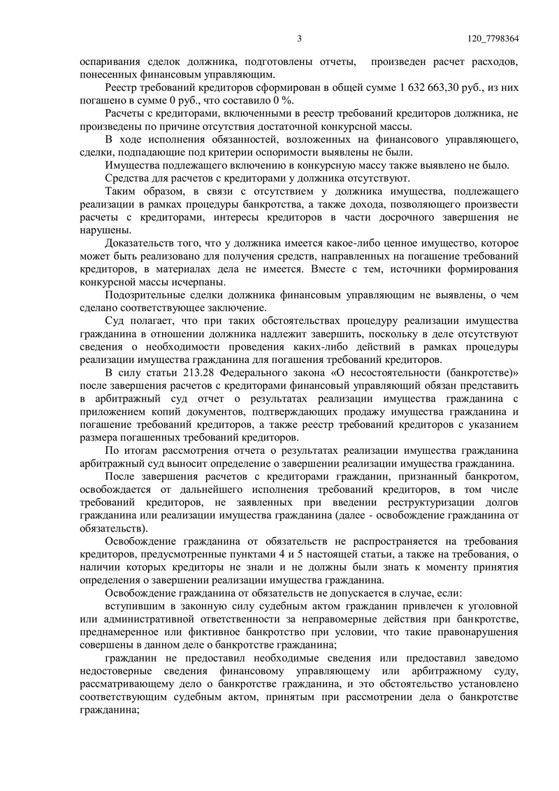 Финансовый управляющий провел весь обязательный комплекс мероприятий: запросил сведения об имуществе и счетах, проанализировал финансовое состояние, подготовил заключение об отсутствии оснований для оспаривания сделок. Суд отметил, что подозрительных сделок не выявлено, а имущество, подлежащее включению в конкурсную массу, отсутствует. В результате погашение требований кредиторов составило 0 руб. (0%) — не потому, что «ничего не делали», а потому что закон прямо связывает выплаты с наличием конкурсной массы.