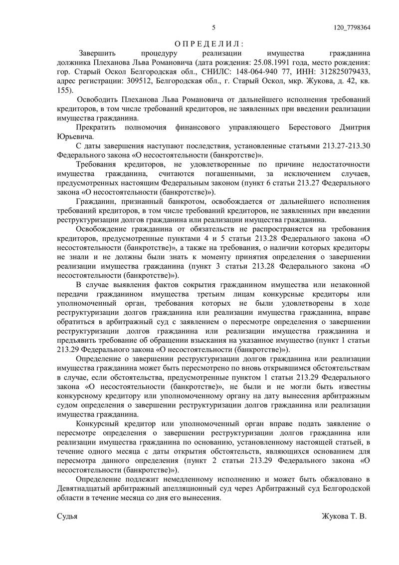 В Арбитражном суде Белгородской области успешно завершилась процедура банкротства гражданина, сопровождаемая юристами компании ДОЛГАМ.НЕТ. Суд определил завершить реализацию имущества и освободить гражданина от дальнейшего исполнения обязательств — именно такой итог и является ключевой целью законного банкротства физического лица.