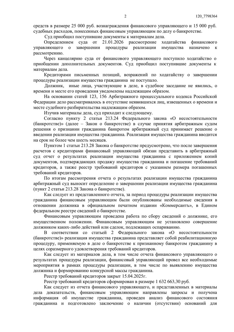 Важно, что даже при исходной общей долговой нагрузке клиента 5 287 858,00 руб. в реестр включаются только те требования, которые кредиторы заявили в установленный срок. В данном деле реестр требований кредиторов был закрыт 15.04.2025, а общая сумма требований, включенных в реестр, составила 1 632 663,30 руб.