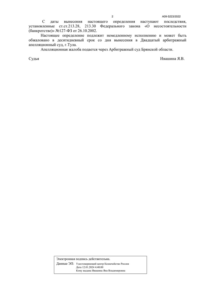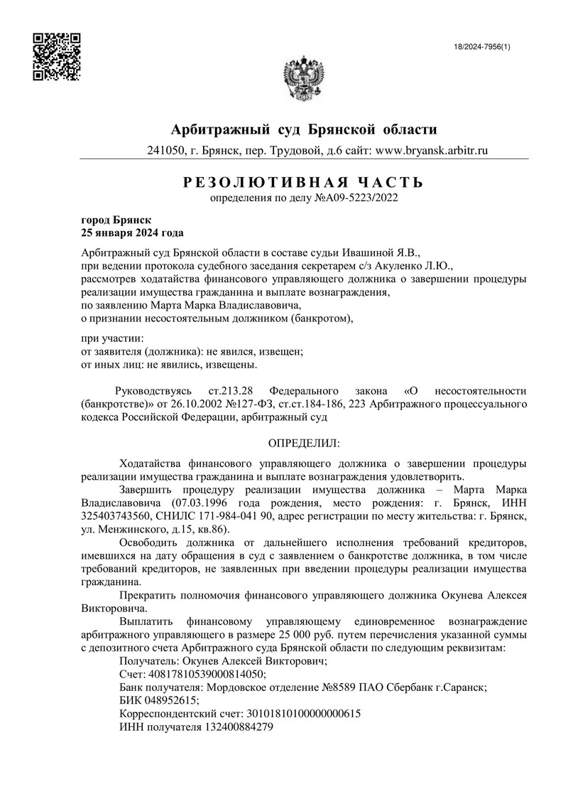 В итоге, 25 января 2024 года Арбитражный суд Брянской области удовлетворил ходатайство финансового управляющего о завершении процедуры реализации имущества должника. Суд освободил нашего клиента от дальнейшего исполнения обязательств перед кредиторами.