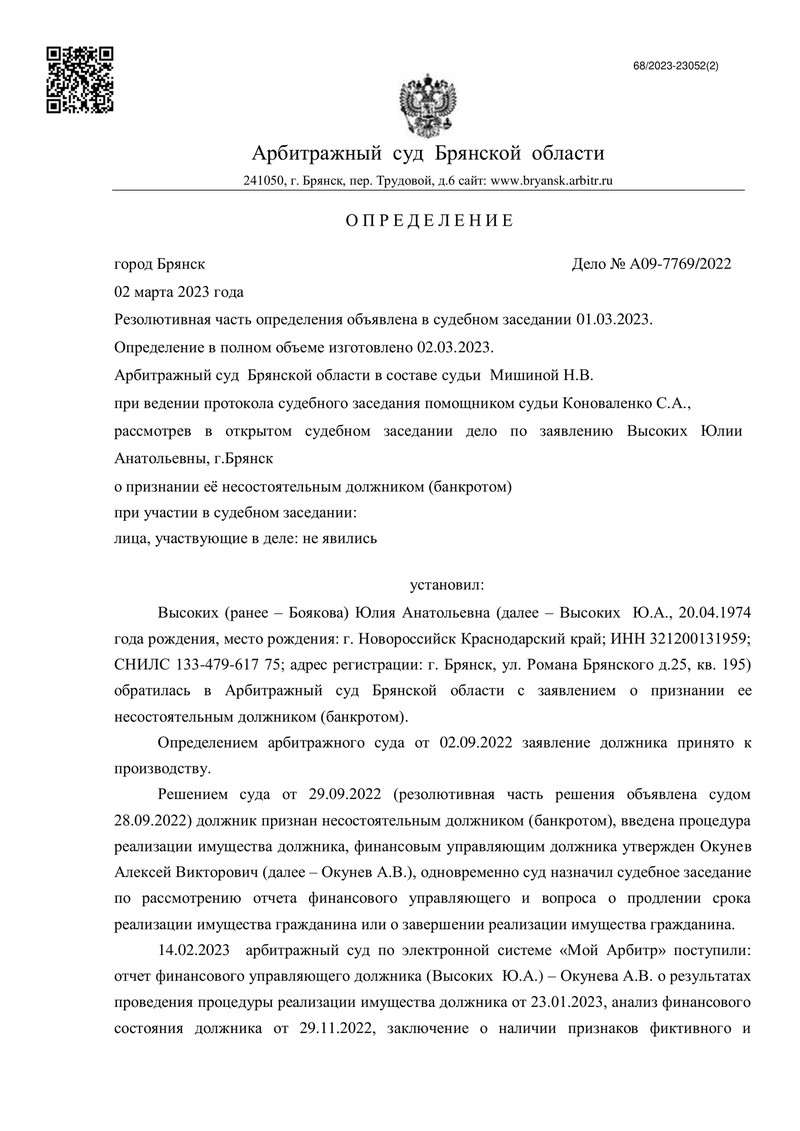Дело было заведено по заявлению гражданина о признании его банкротом. Судебные заседания проходили при участии судьи и финансового управляющего. В процедуре было тщательно изучено финансовое состояние нашей клиентки и проведены подробные проверки.