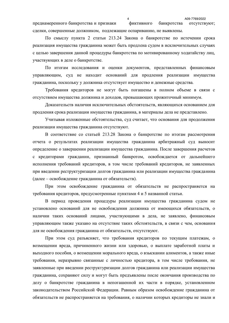 Результатом дела стало освобождение должника от дальнейшего исполнения требований кредиторов. Суд также подтвердил отсутствие необходимости в продлении процедуры реализации имущества, так как у должника нет зарегистрированного имущества и доходов, превышающих прожиточный минимум.