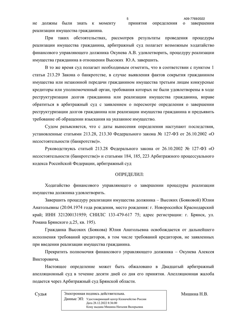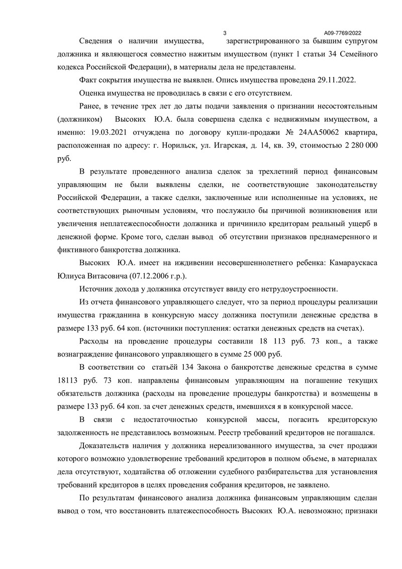 Примечательно, что все действия клиента были тщательно проверены на предмет фиктивного и преднамеренного банкротства. По итогам анализа, сделанного финансовым управляющим, никаких признаков нарушений выявлено не было. Исследование показало, что сделки, совершенные клиентом в последние три года, полностью соответствуют законодательству Российской Федерации.