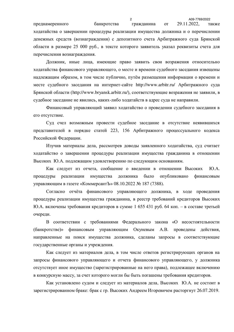 В процессе было выявлено, что должник имеет задолженность в размере 1 655 431 руб. 64 коп. и у него отсутствует имущество, которое могло бы быть использовано для погашения долгов. Суд удовлетворил ходатайство финансового управляющего и завершил процедуру реализации имущества.