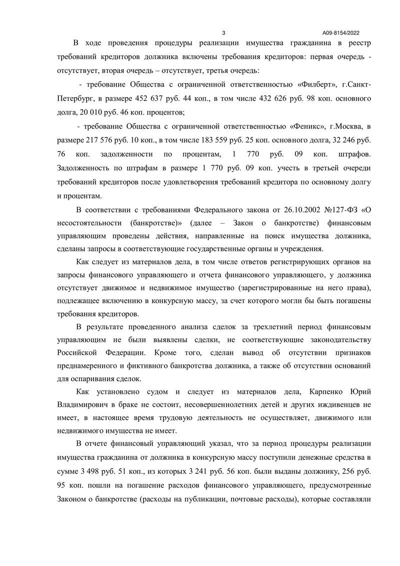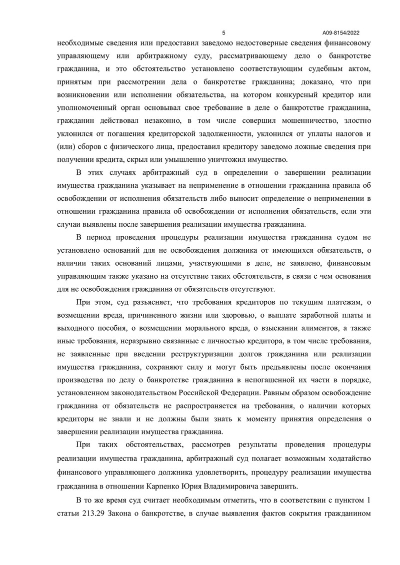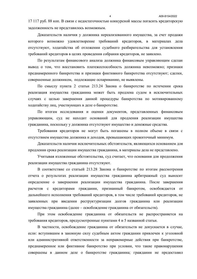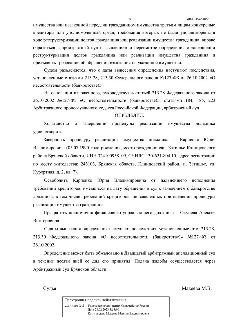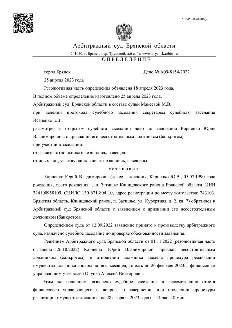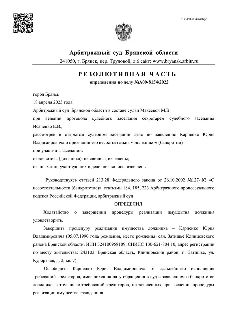 Заседания проходили 28 февраля и 11-18 апреля 2023 года. В результате суд определил завершить процедуру реализации имущества должника и освободить нашего клиента от дальнейшего исполнения требований кредиторов.