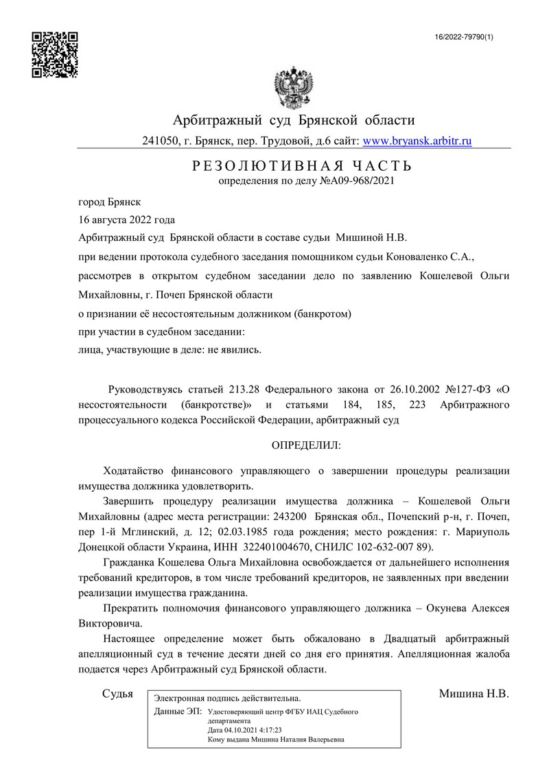Ещё один клиент компании "ДОЛГАМ.НЕТ" смог решить свои финансовые трудности и обрести долгожданную свободу от долговых обязательств. Дело №А09-968/2021 успешно завершилось в Арбитражном суде Брянской области 16 августа 2022 года.