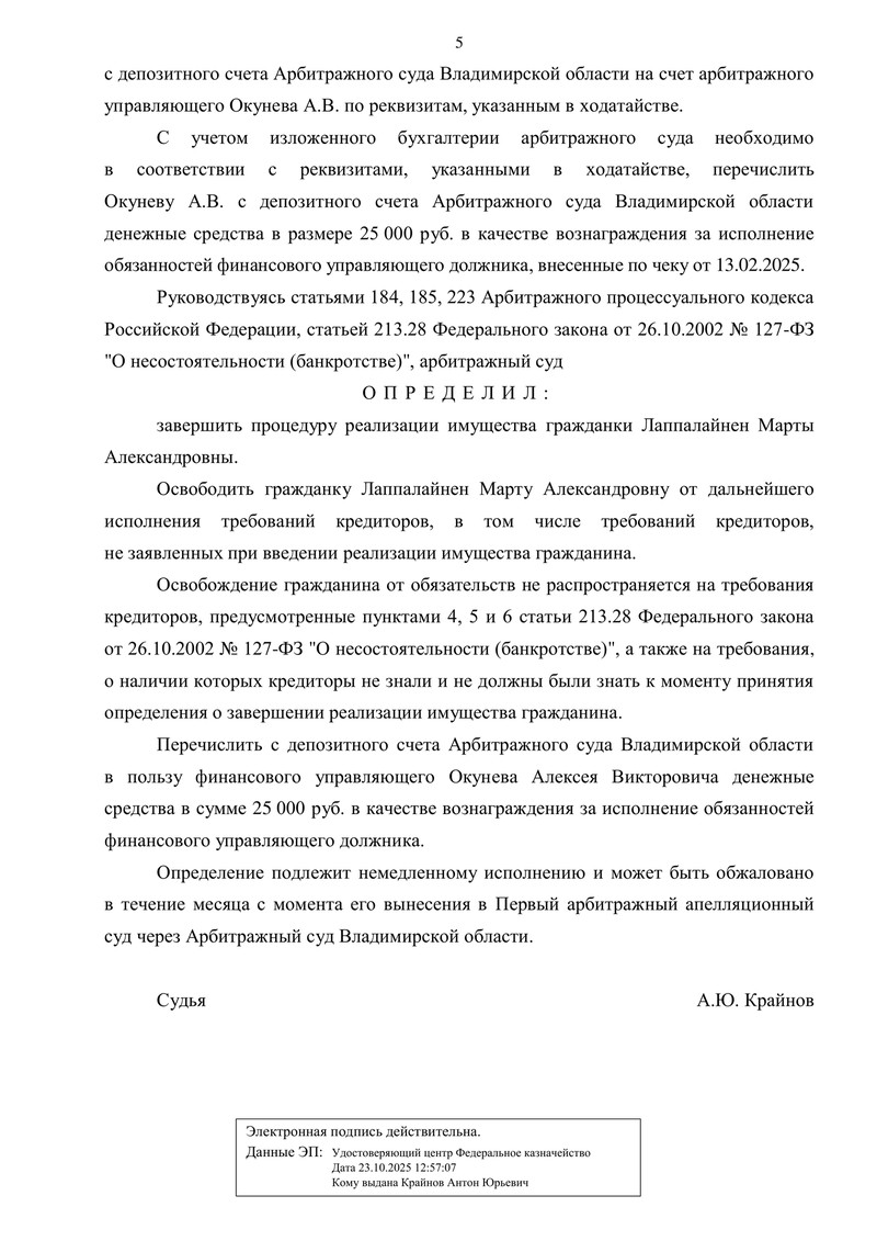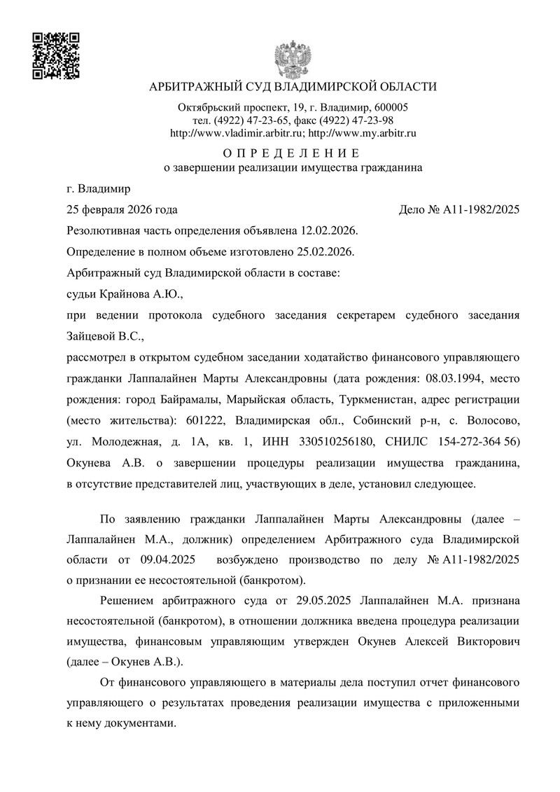 Арбитражный суд Владимирской области завершил процедуру банкротства гражданина в форме реализации имущества. Определение о завершении реализации имущества вынесено 25.02.2026 (резолютивная часть объявлена 12.02.2026). Дело рассмотрено судьей А.Ю. Крайновым.
