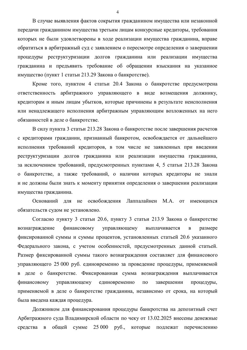 Также суд урегулировал вопрос вознаграждения финансового управляющего: должником заранее были внесены средства на депозит суда, и суд определил перечислить 25 000 руб. финансовому управляющему.