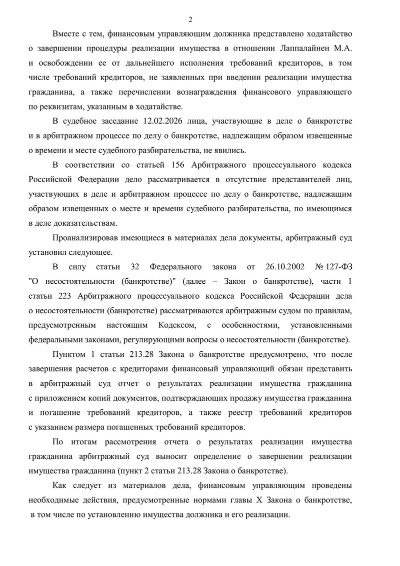 Производство по делу было возбуждено определением суда от 09.04.2025, а решением от 29.05.2025 гражданин признан банкротом и введена процедура реализации имущества. Финансовый управляющий представил суду отчет о результатах процедуры и ходатайство о ее завершении с освобождением гражданина от дальнейшего исполнения требований кредиторов.