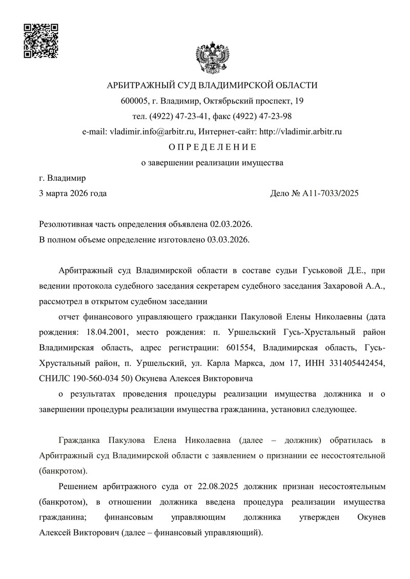 - 03.03.2026 Арбитражный суд Владимирской области (судья Гуськова Д.Е.) вынес определение о завершении реализации имущества.