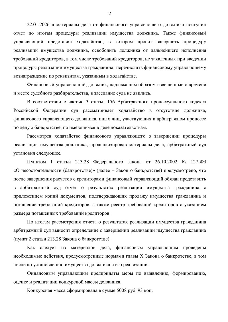 - 22.01.2026 финансовый управляющий представил отчет о результатах процедуры и ходатайство о ее завершении.