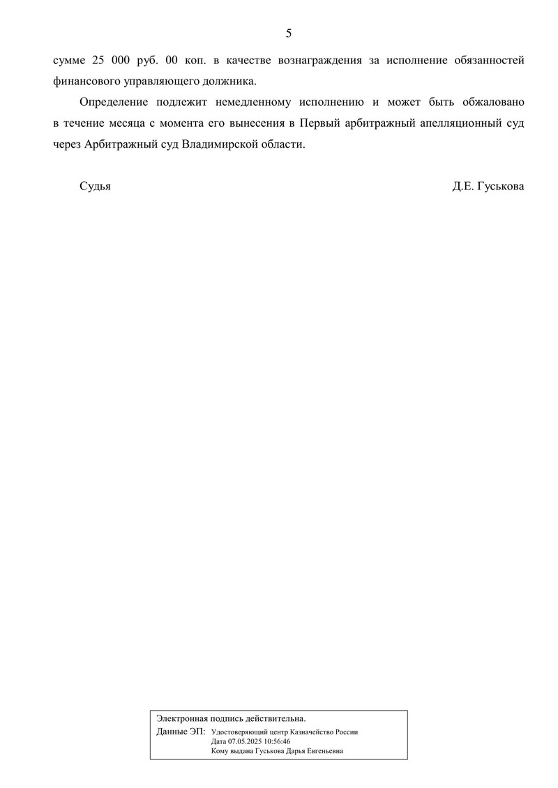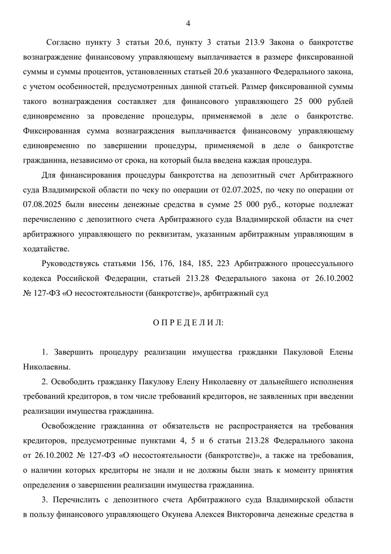 Также суд определил перечислить финансовому управляющему фиксированное вознаграждение 25 000,00 руб. — средства ранее были внесены на депозитный счет Арбитражного суда Владимирской области (по операциям от 02.07.2025 и 07.08.2025).