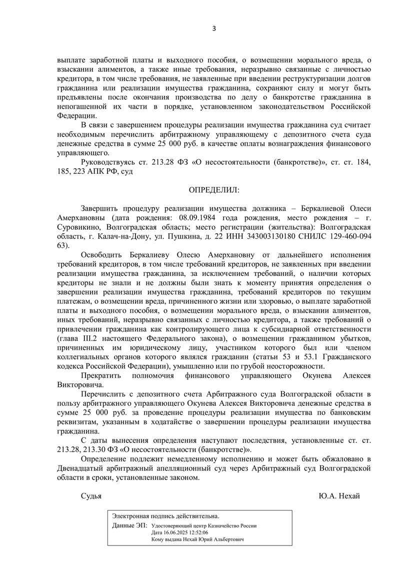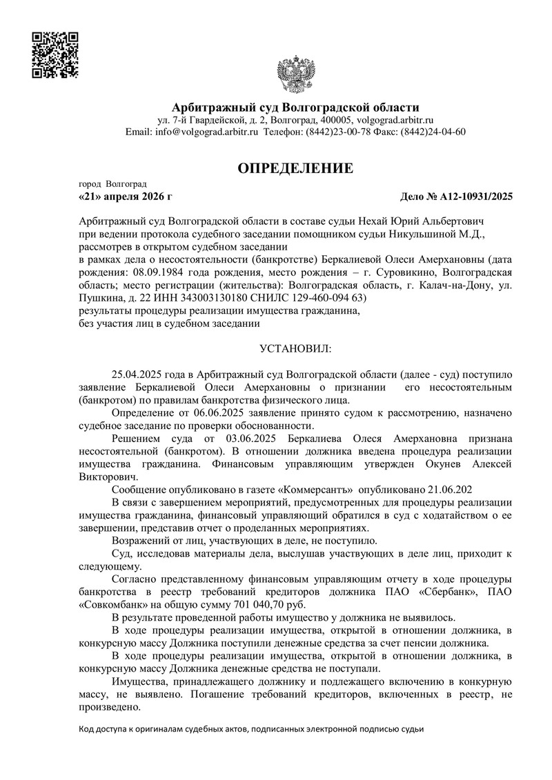 Еще одно успешное дело в копилке "ДОЛГАМ.НЕТ"! Арбитражный суд Волгоградской области завершил процедуру реализации имущества гражданина и освободил нашего клиента от дальнейшего исполнения требований кредиторов. Определение вынесено 21 апреля 2026 года.