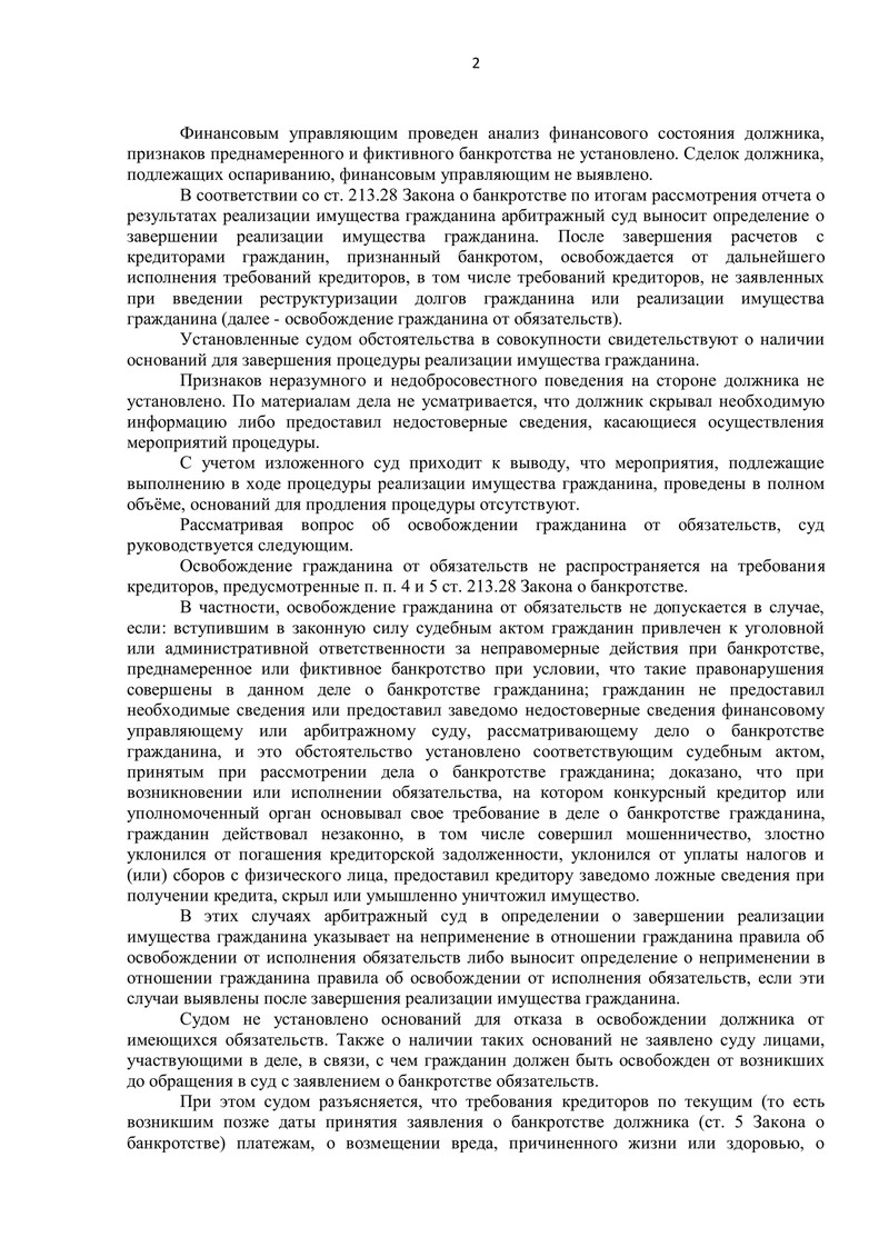- освободить клиента от дальнейшего исполнения требований кредиторов, включая те, которые не были заявлены в процедуре, за исключением обязательств, прямо указанных в законе: текущие платежи, алименты, вред жизни и здоровью и ряд иных требований личного характера;