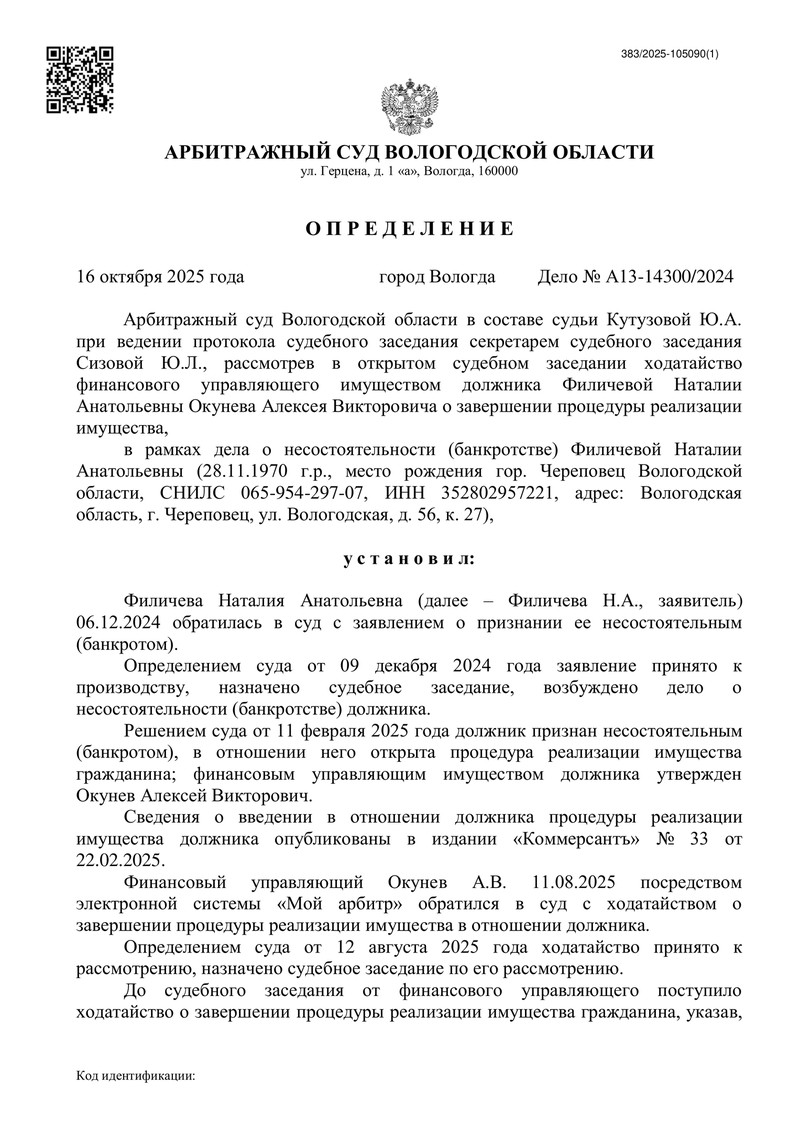 В октябре 2025 года Арбитражный суд Вологодской области вынес важное определение по делу о банкротстве гражданина, который обратился в "ДОЛГАМ.НЕТ" с долгами на сумму 2 695 383 рублей. Благодаря квалифицированной поддержке юристов и грамотному ведению дела процесс банкротства завершился полным освобождением нашего клиента от всех обязательств!
