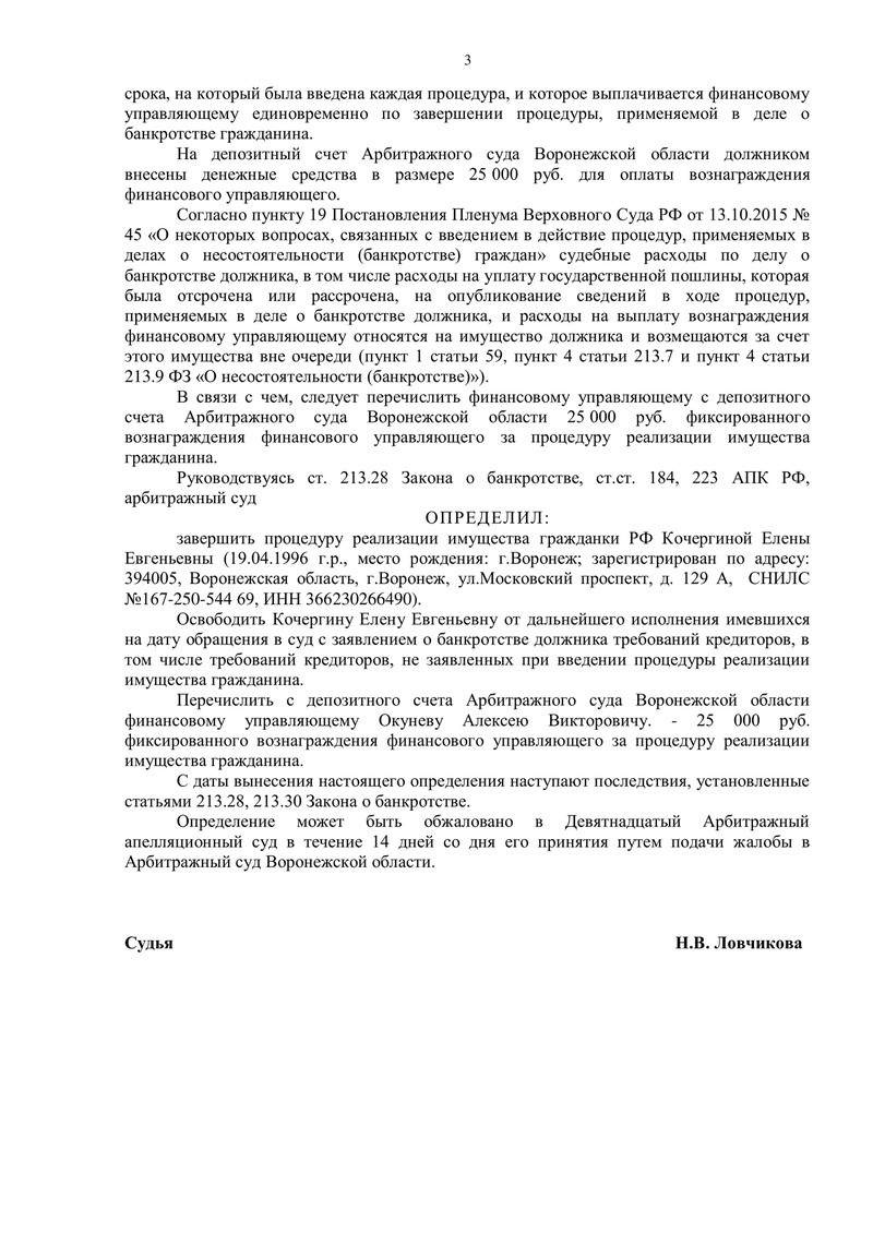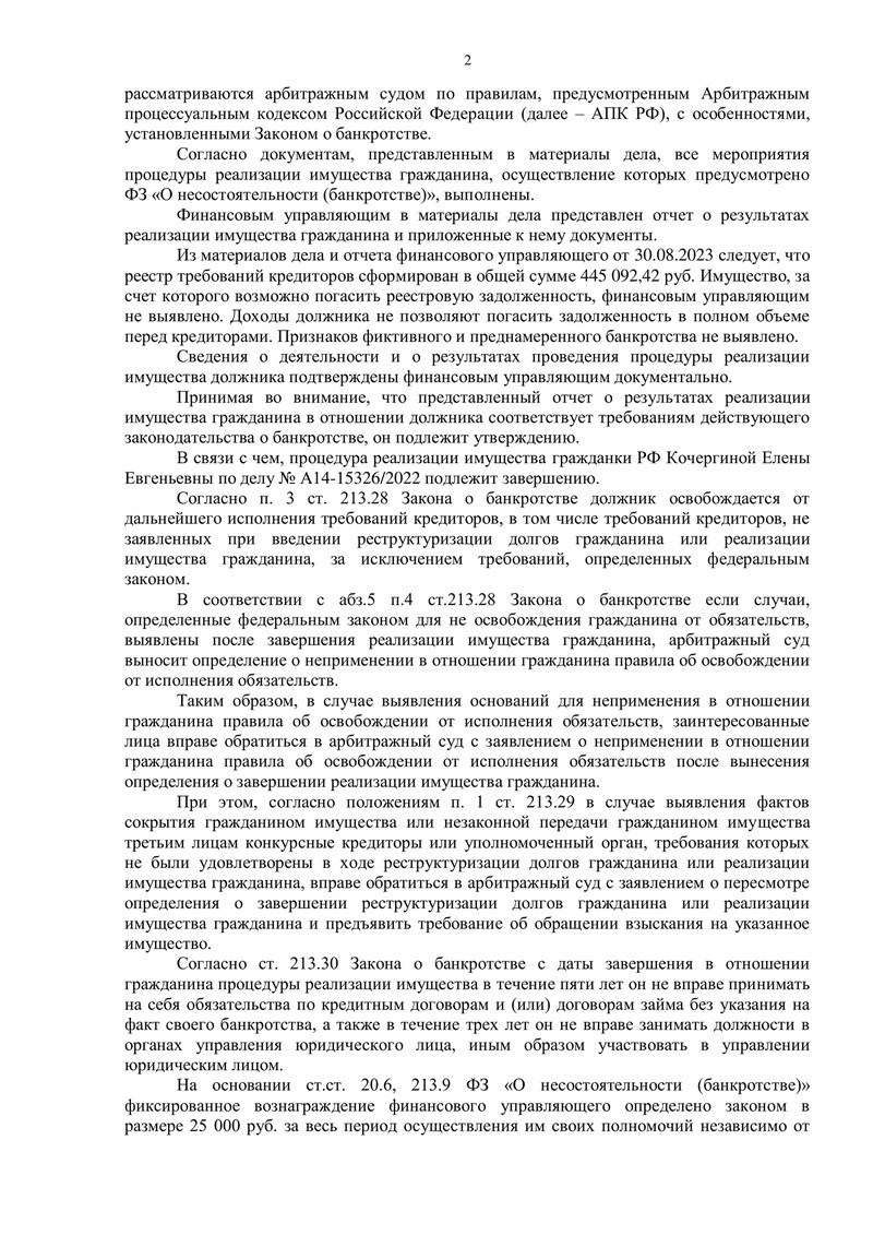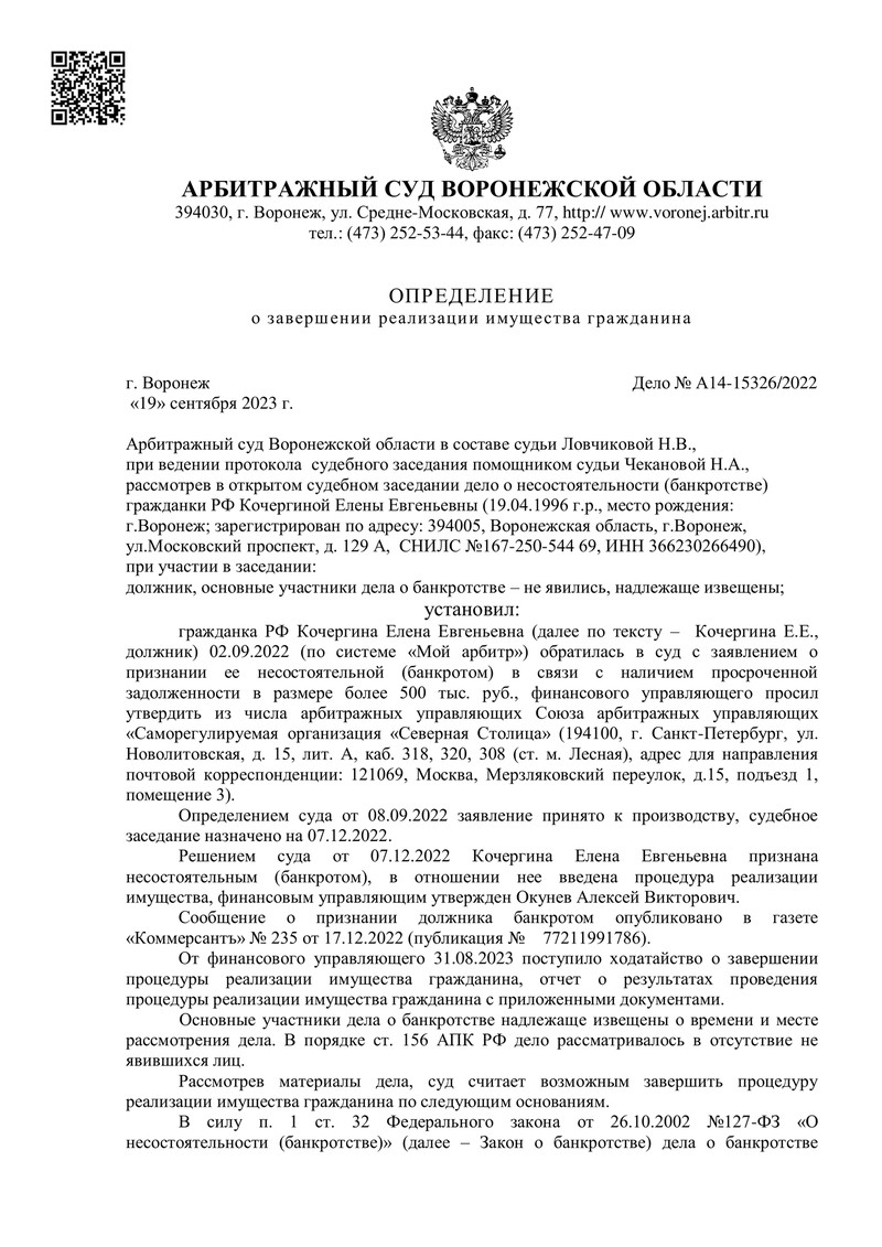 Дело №А14-15326/2022 рассматривалось Арбитражным судом Воронежской области в соответствии с Федеральным законом №127-ФЗ "О несостоятельности (банкротстве)". Каждый этап процедуры контролировался финансовым управляющим. Финансовый управляющий подтвердил, что имущество, за счёт которого могла быть погашена задолженность, отсутствовало, а доходы должника не позволяли удовлетворить требования кредиторов в полном объёме.