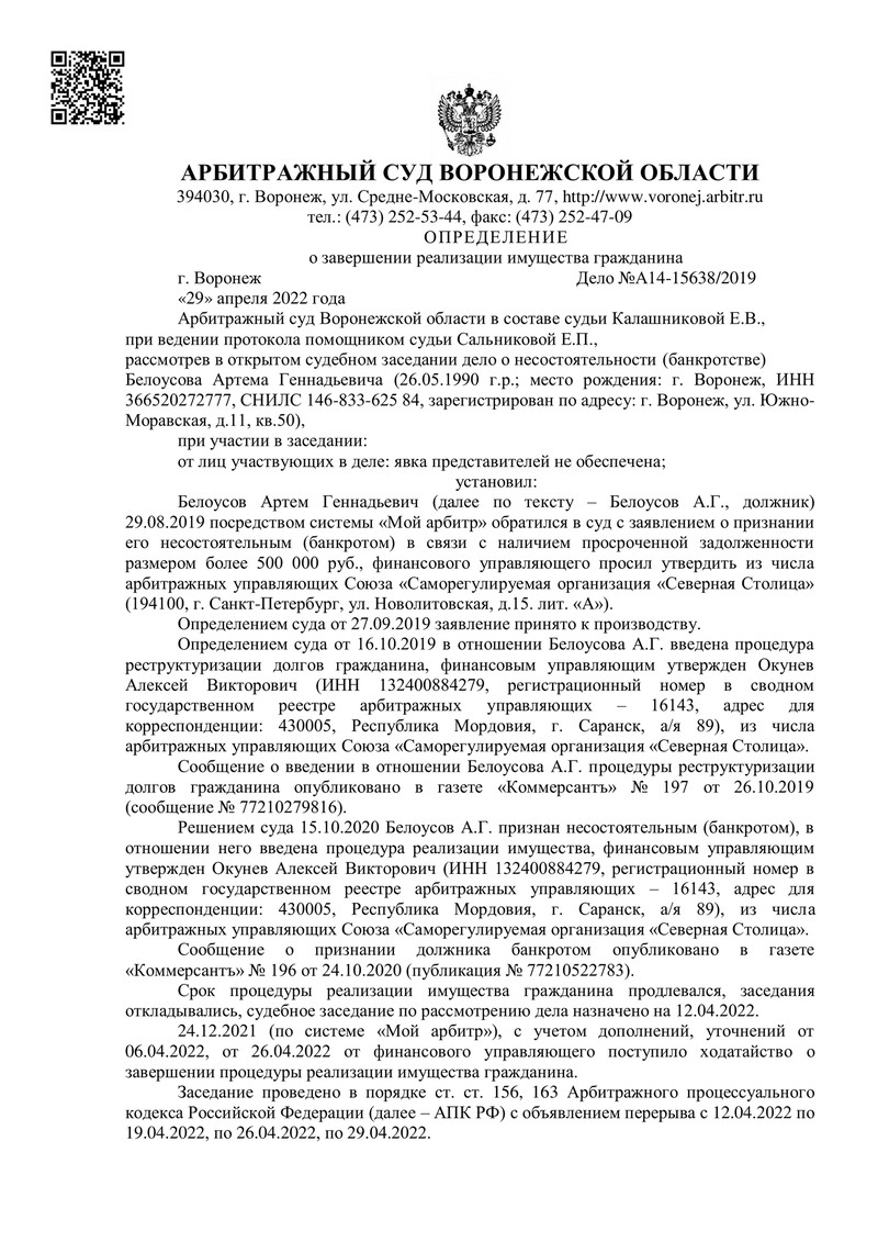 Гражданин обратился за помощью в нашу компанию из-за просроченной задолженности, превышающей 500 000 рублей. 29 августа 2019 года он подал заявление в Арбитражный суд Воронежской области с просьбой признать его несостоятельным. 16 октября 2019 года суд ввел в отношении него процедуру реструктуризации долгов.