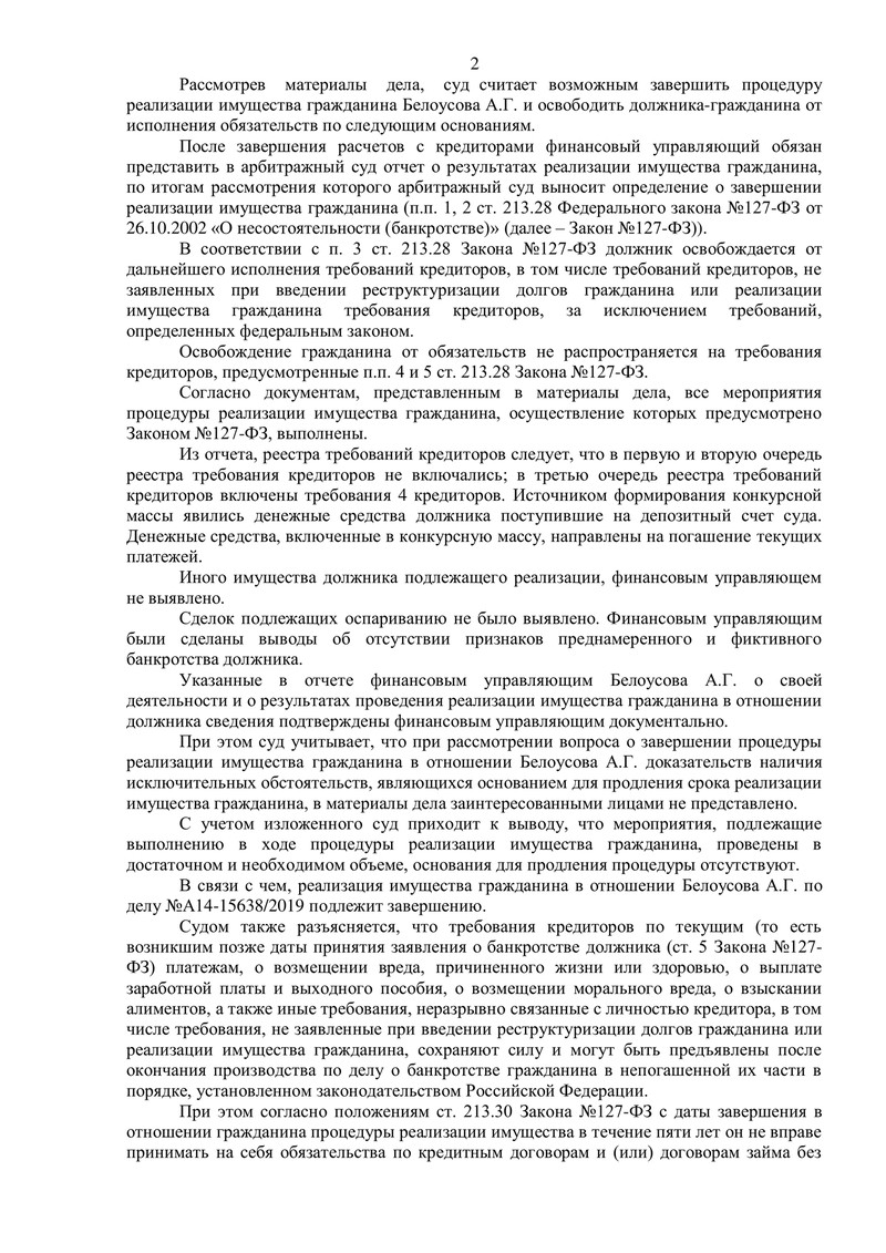 По итогам проверки арбитражный суд отметил отсутствие у должника имущества, подлежащего реализации, а также сделок, которые можно было бы оспорить. Были выполнены все мероприятия, предусмотренные Законом о банкротстве, и 29 апреля 2022 года суд завершил процедуру реализации имущества нашего клиента и освободил его от дальнейшего исполнения обязательств перед кредиторами.
