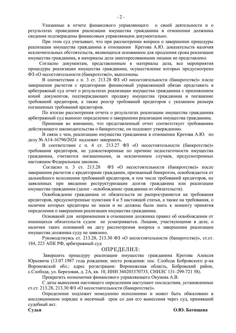 Дело № А14-16796/2024 (Воронежская область): процедура банкротства завершена, клиент освобожден от долгов