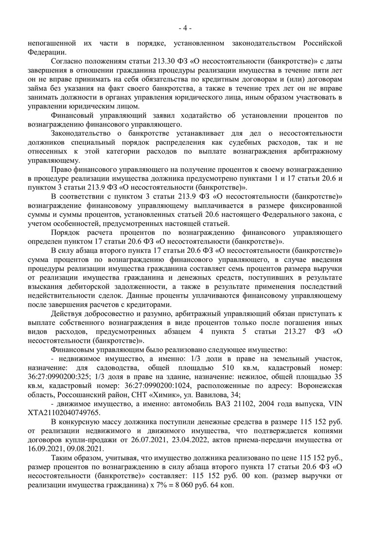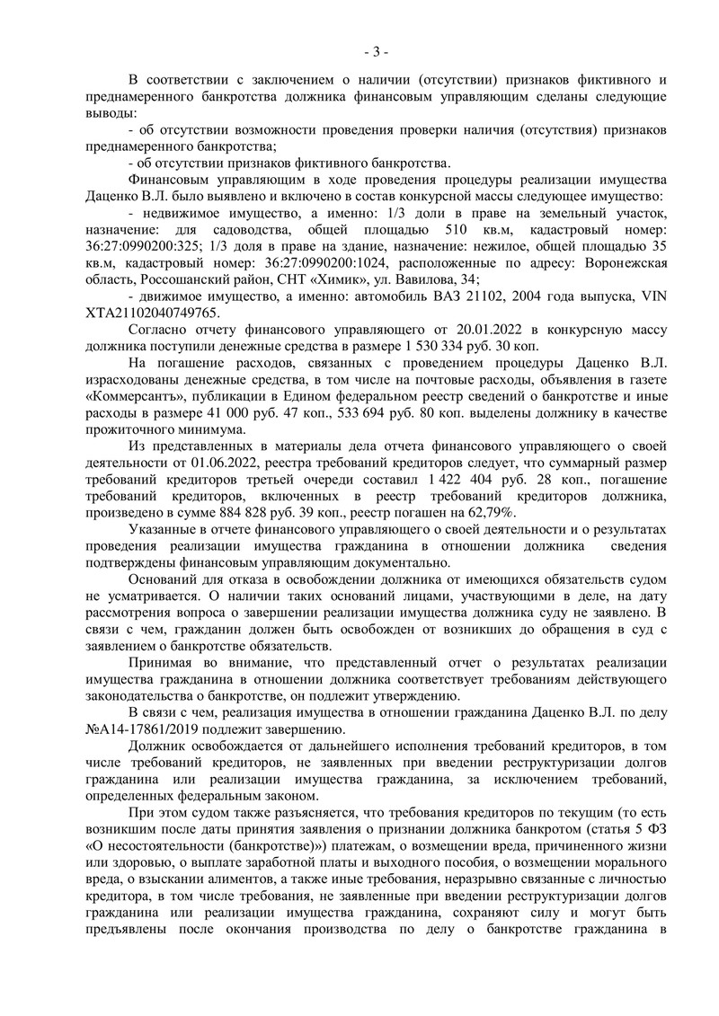 Средства от продажи позволили покрыть значительную часть долгов и расходов, связанных с процедурой банкротства. Кредиторы получили 884 828 руб., что составило 62,79% от общего размера заявленной задолженности.