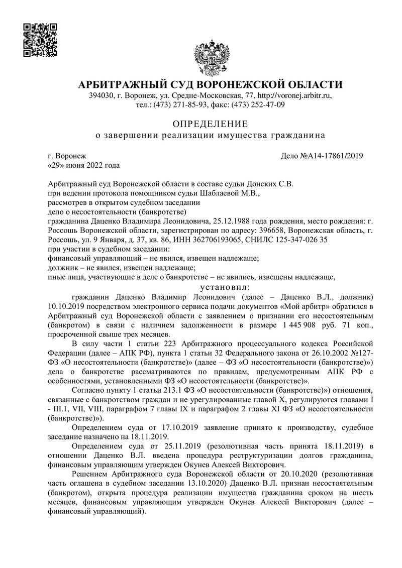 Компания "ДОЛГАМ.НЕТ" вновь добилась успеха, помогая своему клиенту обрести финансовую свободу! Арбитражный суд Воронежской области освободил от долгов гражданина, чей долг составлял значительную сумму в 1 445 908 руб.