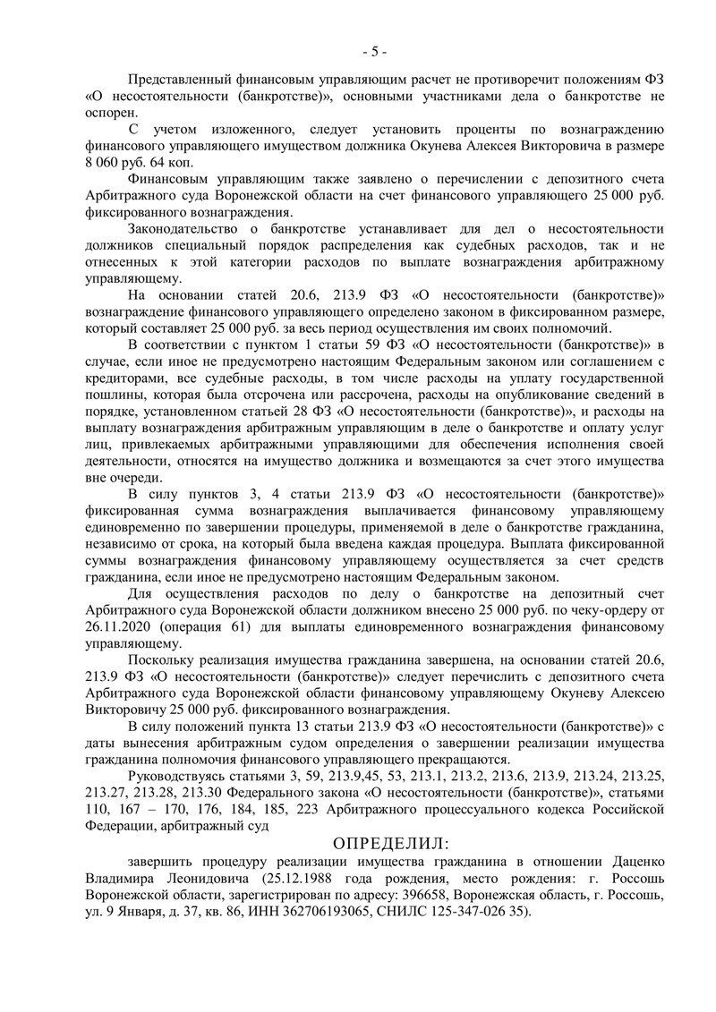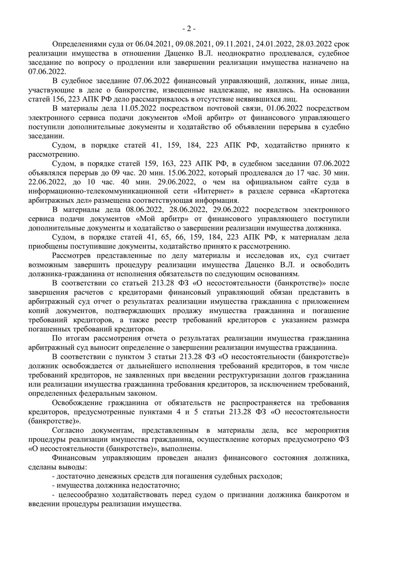 Суд изучил отчет финансового управляющего и завершил процедуру реализацию имущества. Наш клиент был освобожден от дальнейшего исполнения обязательств перед кредиторами благодаря слаженной работе команды "ДОЛГАМ.НЕТ" и четкому соблюдению Закона о банкротстве.