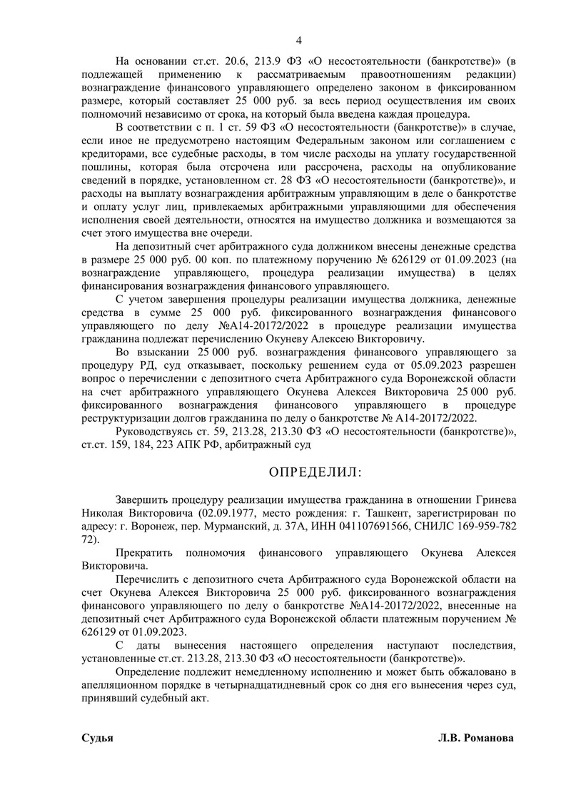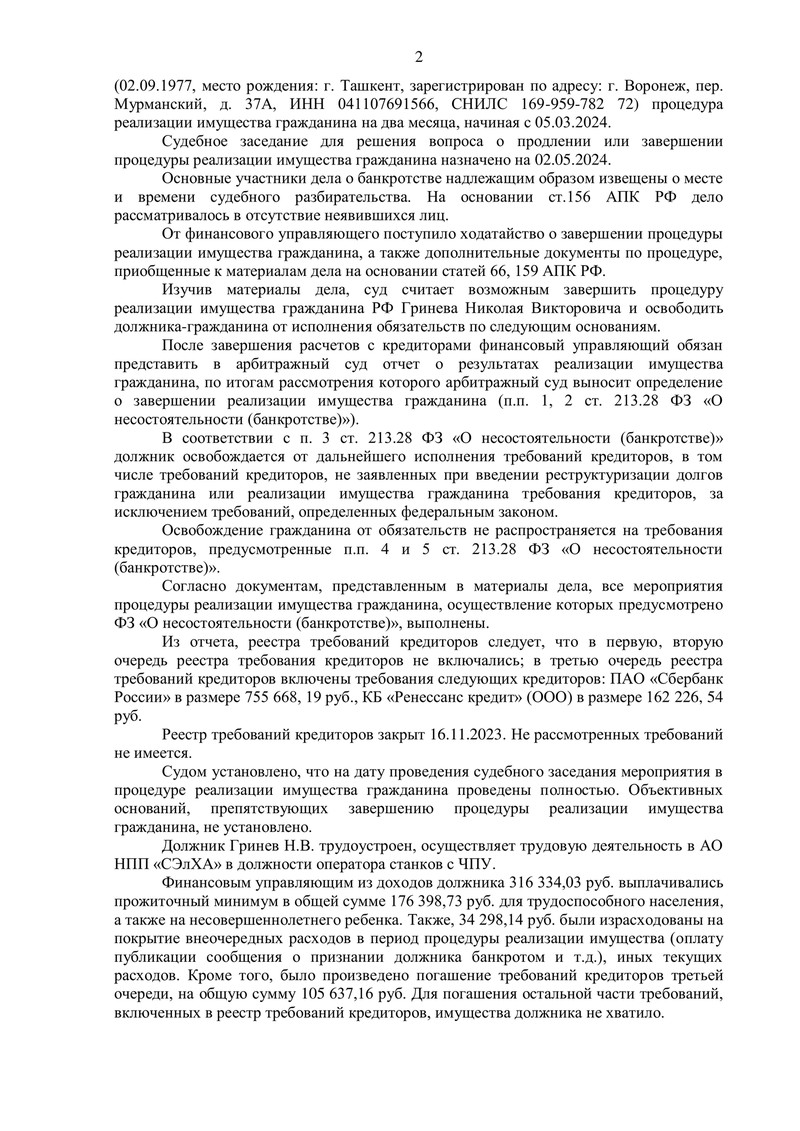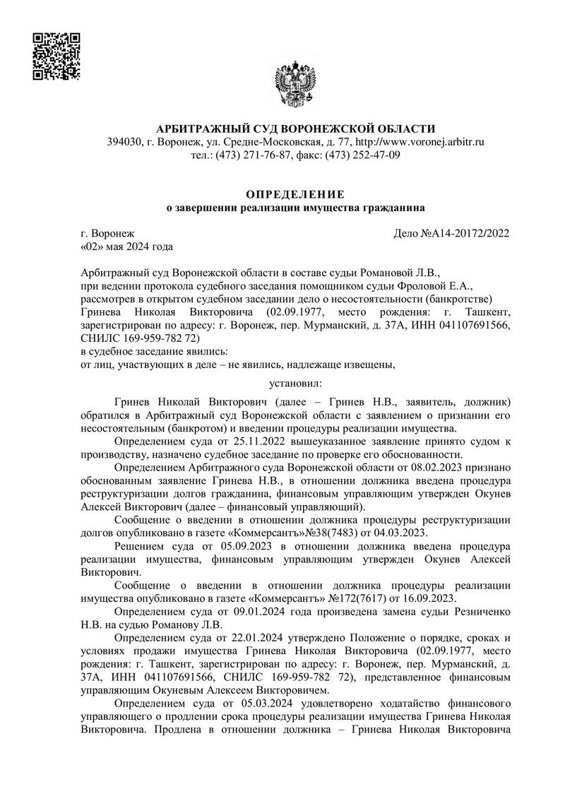 Еще один клиент компании "ДОЛГАМ.НЕТ" прошел процедуру банкротства и освободился от долгового бремени. Арбитражный суд Воронежской области 2 мая 2024 года завершил процедуру реализации имущества гражданина, который был признан банкротом по делу №А14-20172/2022.