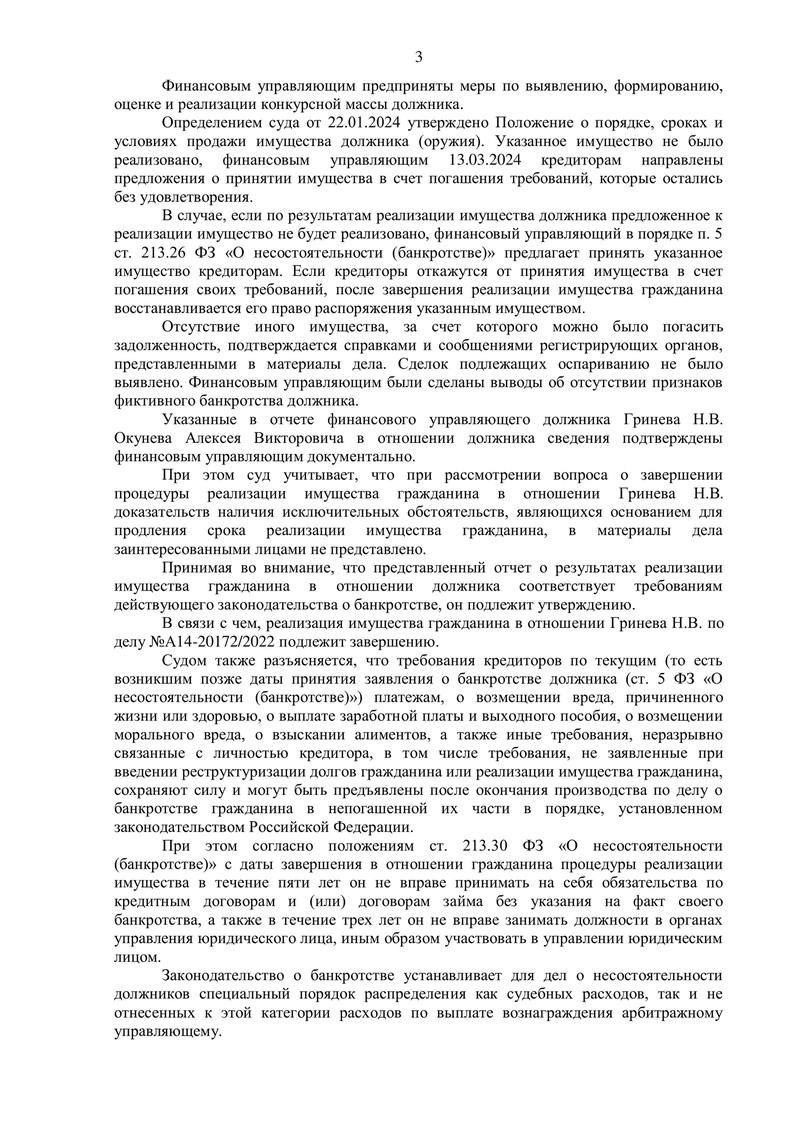 Судебное определение завершило процедуру реализации имущества и освободило нашего клиента от дальнейшего исполнения обязательств перед кредиторами, что является значимым шагом к финансовому восстановлению должника.