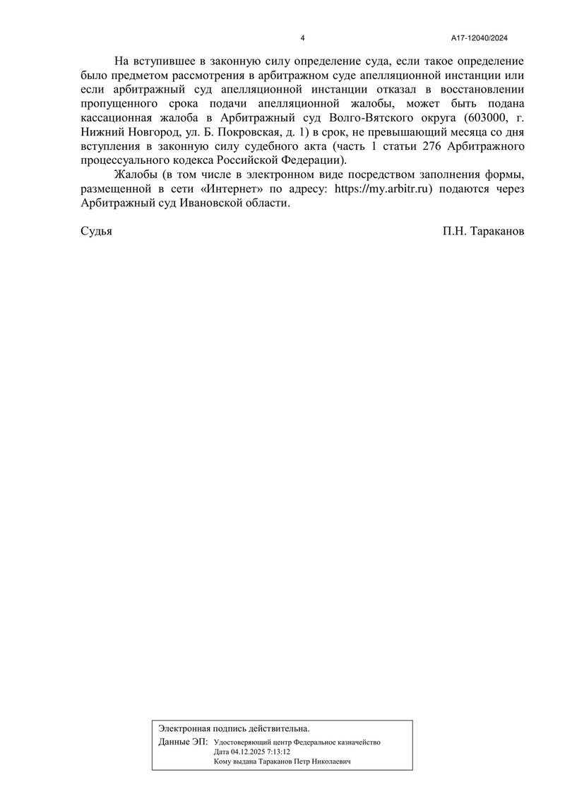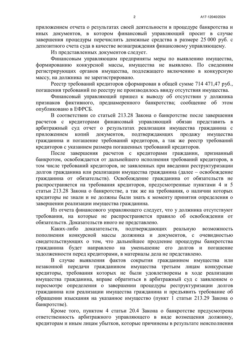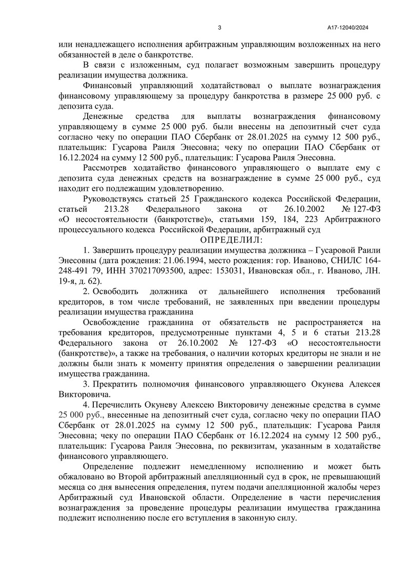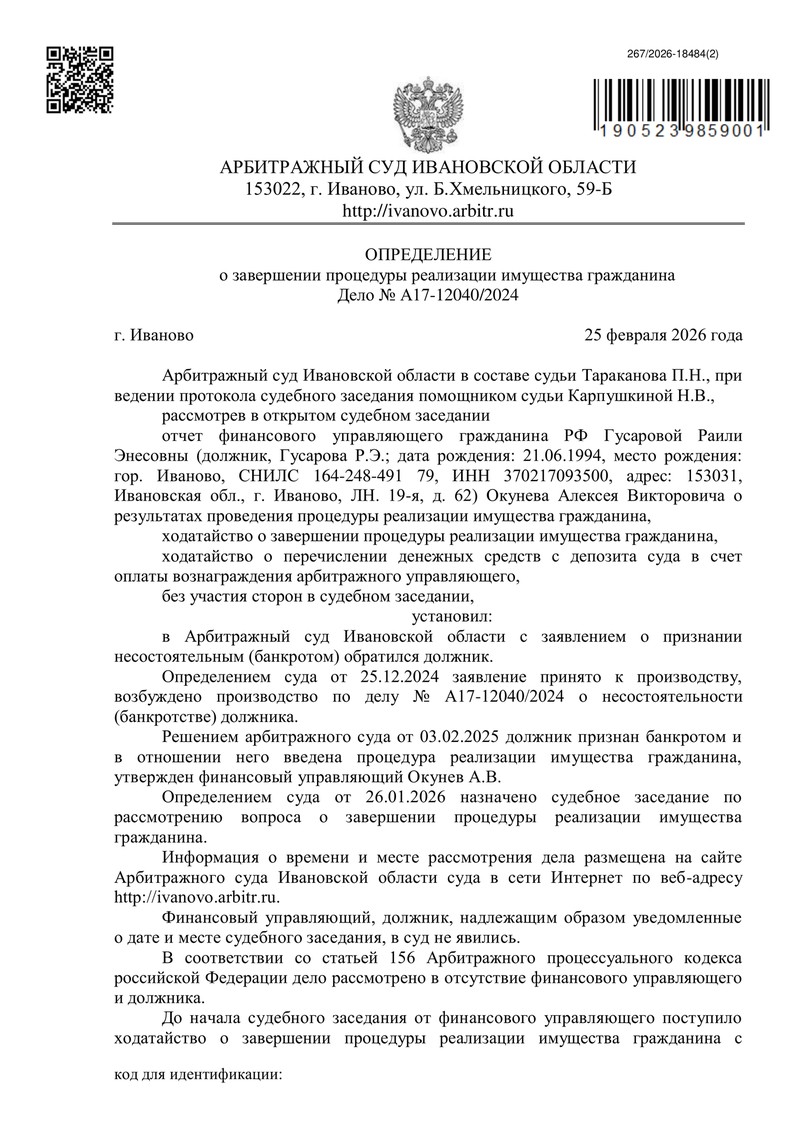 Дело № А17-12040/2024: банкротство физического лица в Ивановской области завершено, долги списаны