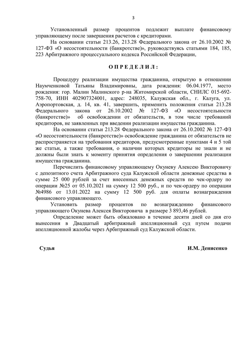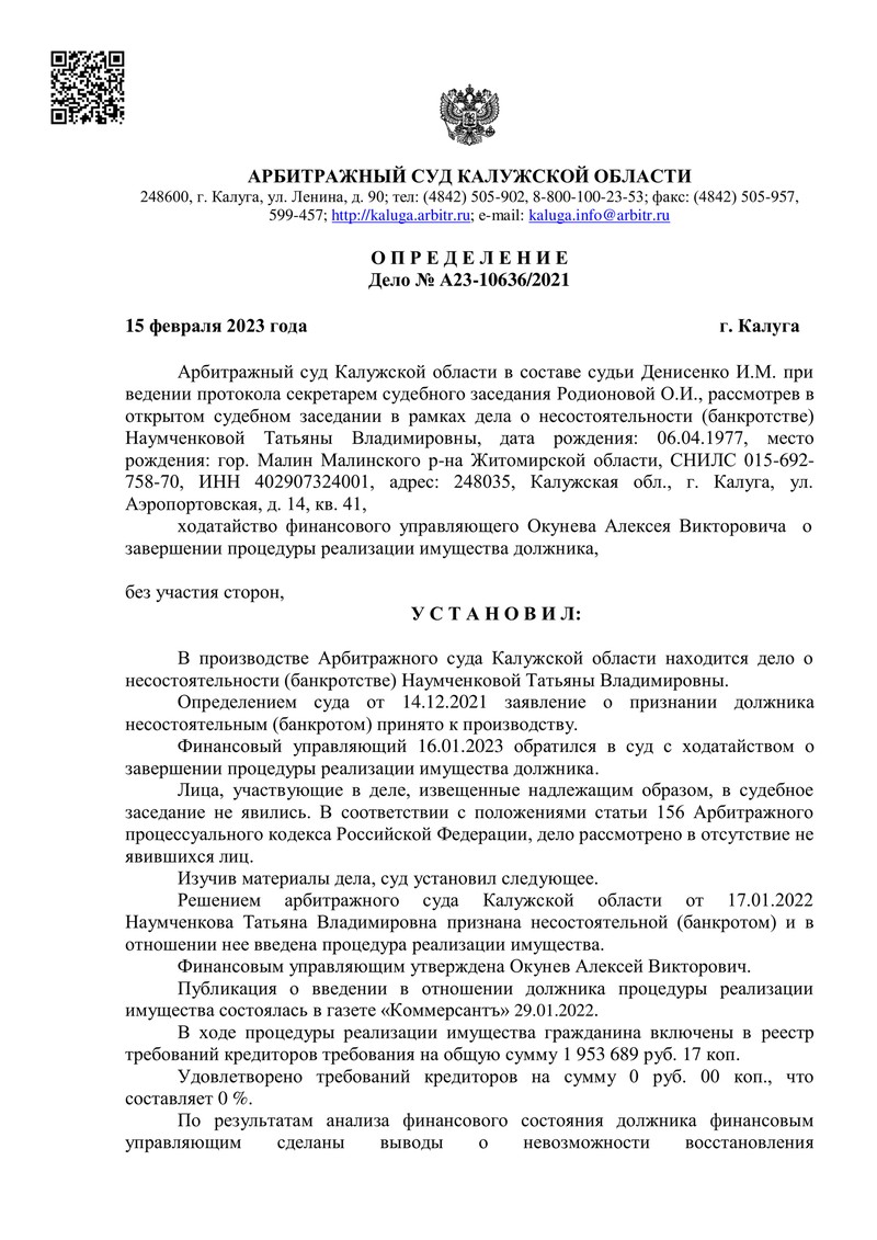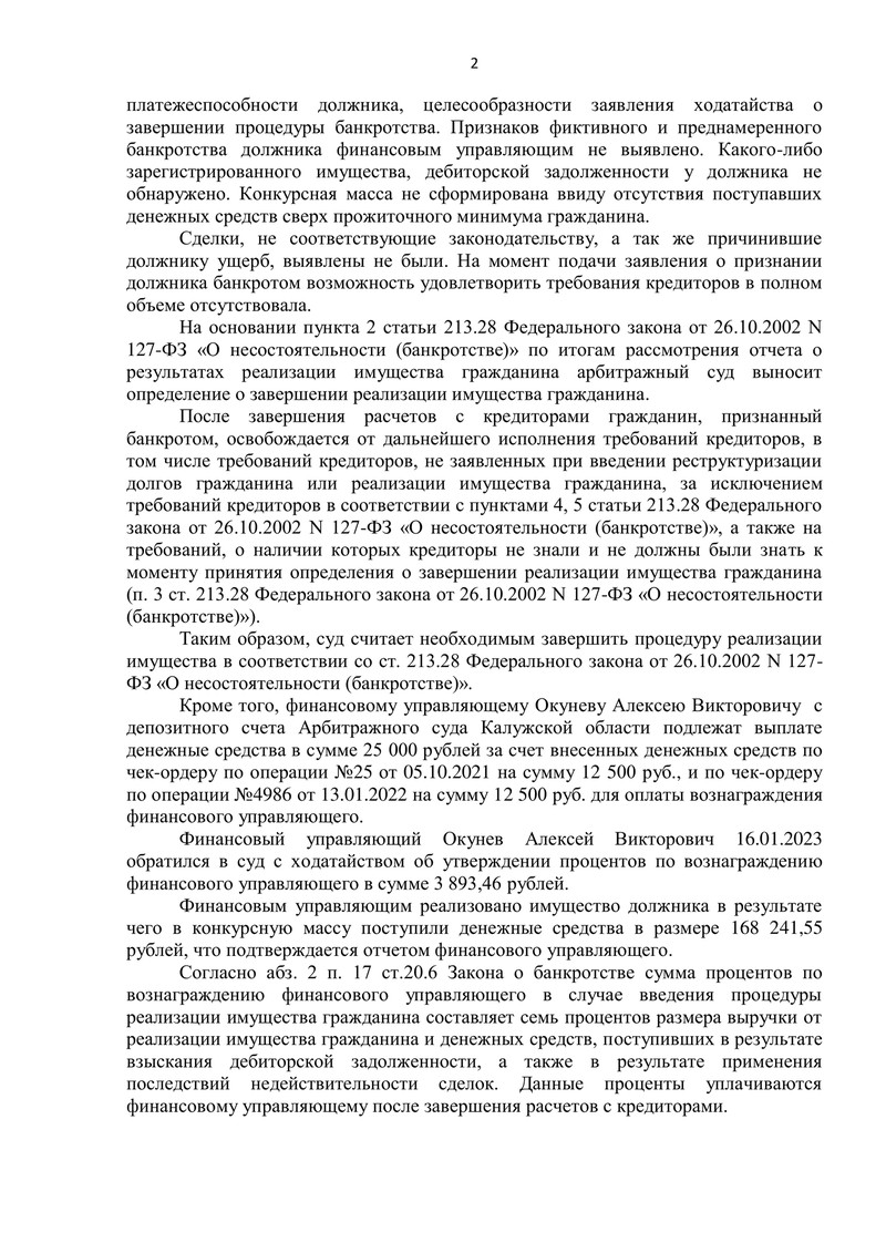 На основании пункта 2 статьи 213.28 Федерального закона №127-ФЗ "О несостоятельности (банкротстве)" Арбитражный суд Калужской области вынес определение о завершении процедуры реализации имущества. После расчетов с кредиторами гражданин, признанный банкротом, освобождается от дальнейшего исполнения требований кредиторов.