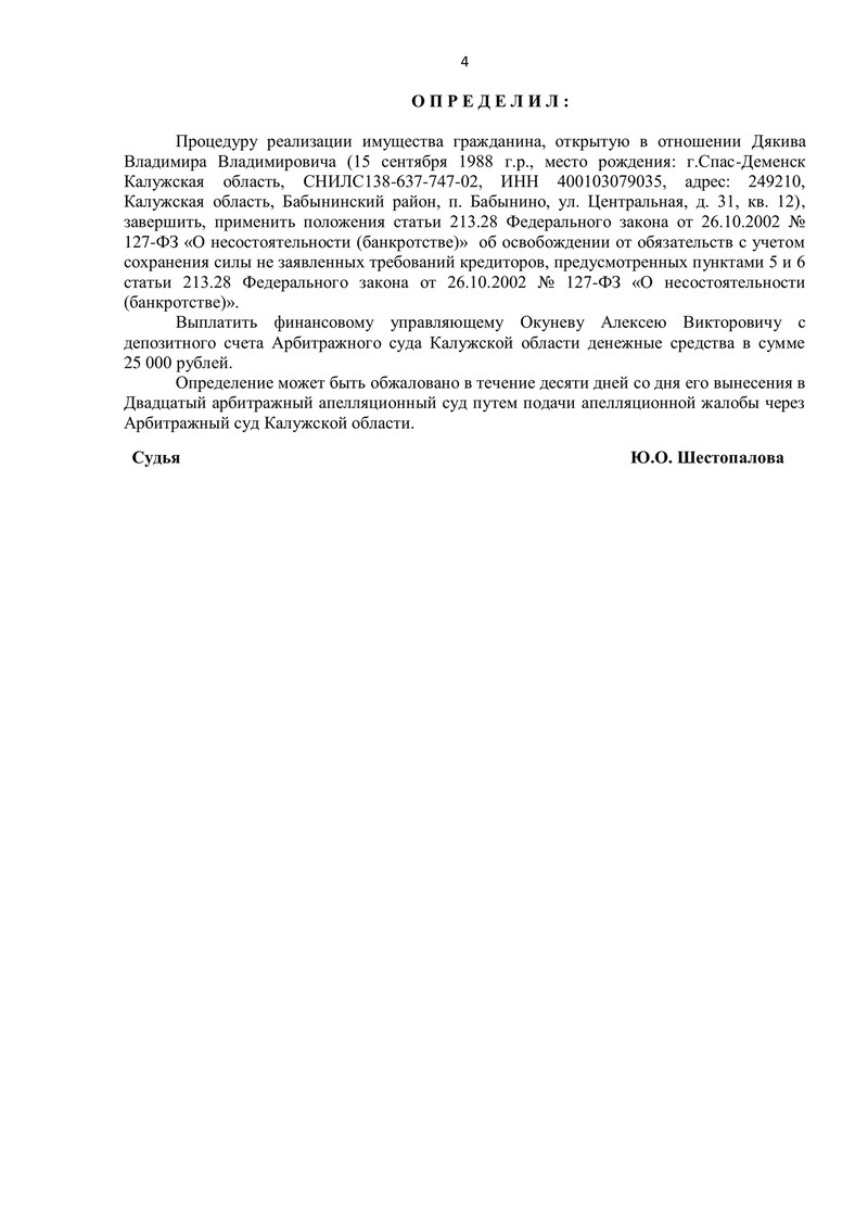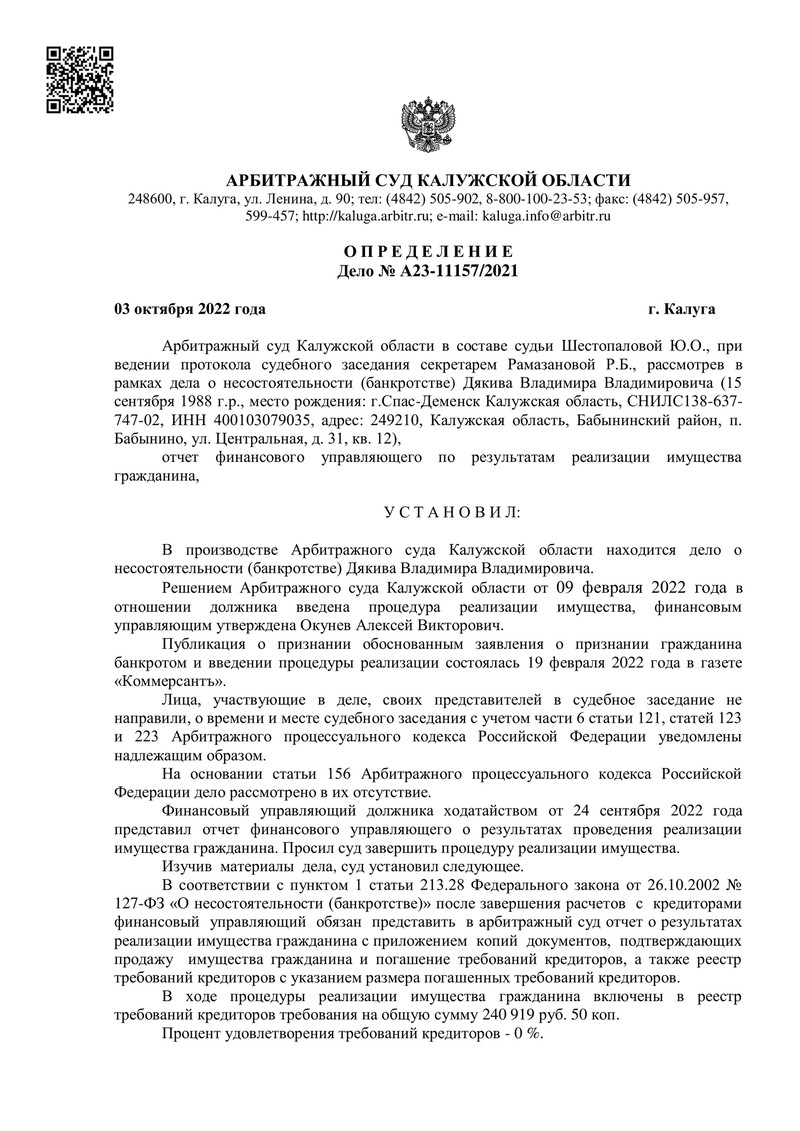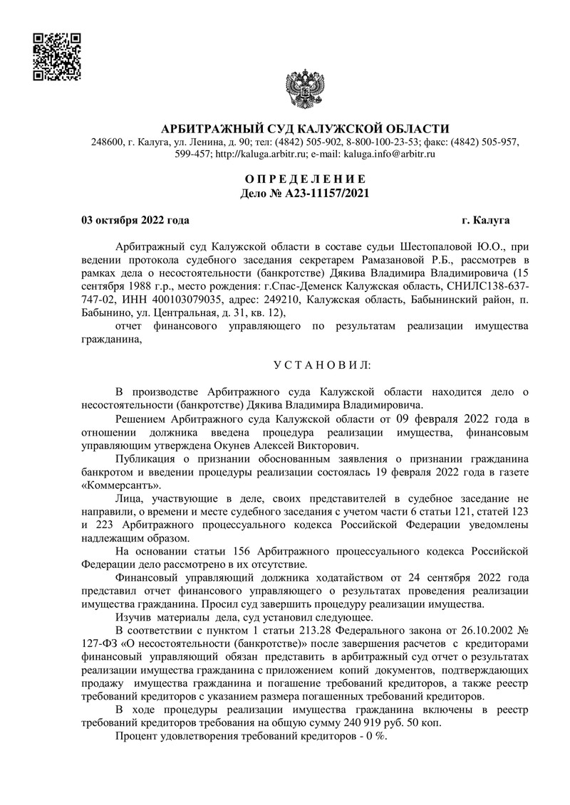 Компания "ДОЛГАМ.НЕТ" помогла еще одному своему клиенту обрести финансовую свободу! Определением Арбитражного суда Калужской области процедура реализации имущества, введенная 9 февраля 2022 года, была завершена.