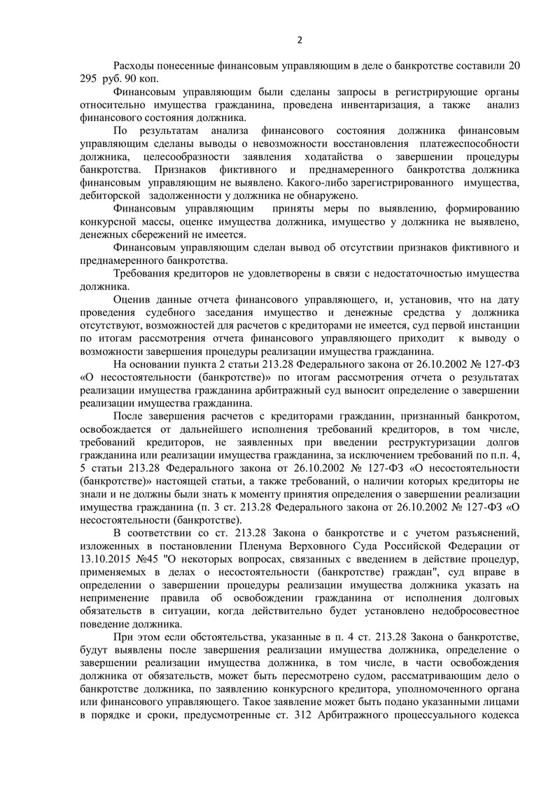 Суд изучил отчет финансового управляющего и пришел к выводу о возможности завершения процедуры реализации имущества. На основании пункта 2 статьи 213.28 Федерального закона №127-ФЗ "О несостоятельности (банкротстве)" гражданин был освобожден от дальнейшего исполнения требований кредиторов.