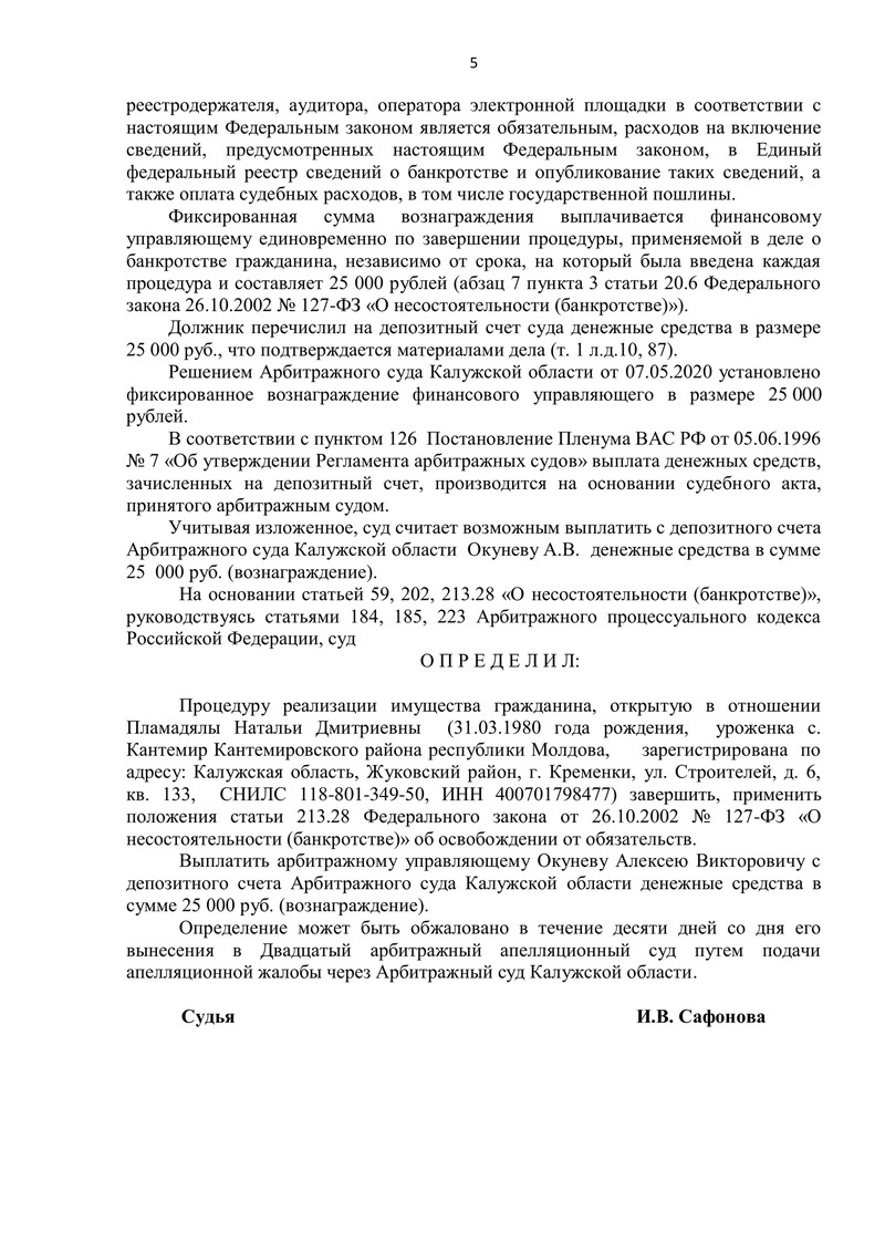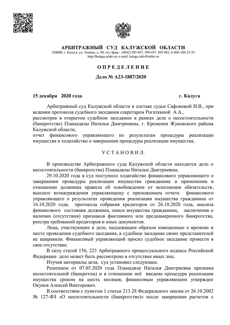 Еще один клиент компании "ДОЛГАМ.НЕТ" прошел процедуру банкротства! Арбитражный суд Калужской области рассмотрел дело №А23-1887/2020 и вынес определение о завершении процедуры реализации имущества.