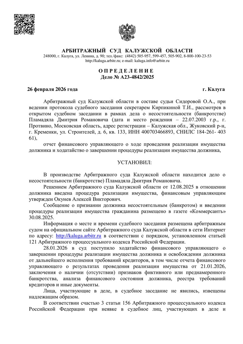 Очередное успешно завершенное банкротство физического лица с ДОЛГАМ.НЕТ — дело № А23-4842/2025. 26 февраля 2026 года Арбитражный суд Калужской области (г. Калуга) в составе судьи О.А. Сидоровой рассмотрел отчет финансового управляющего и пришел к главному результату: процедура реализации имущества завершена, а гражданин освобожден от дальнейшего исполнения требований кредиторов в порядке ст. 213.28 Закона о банкротстве.