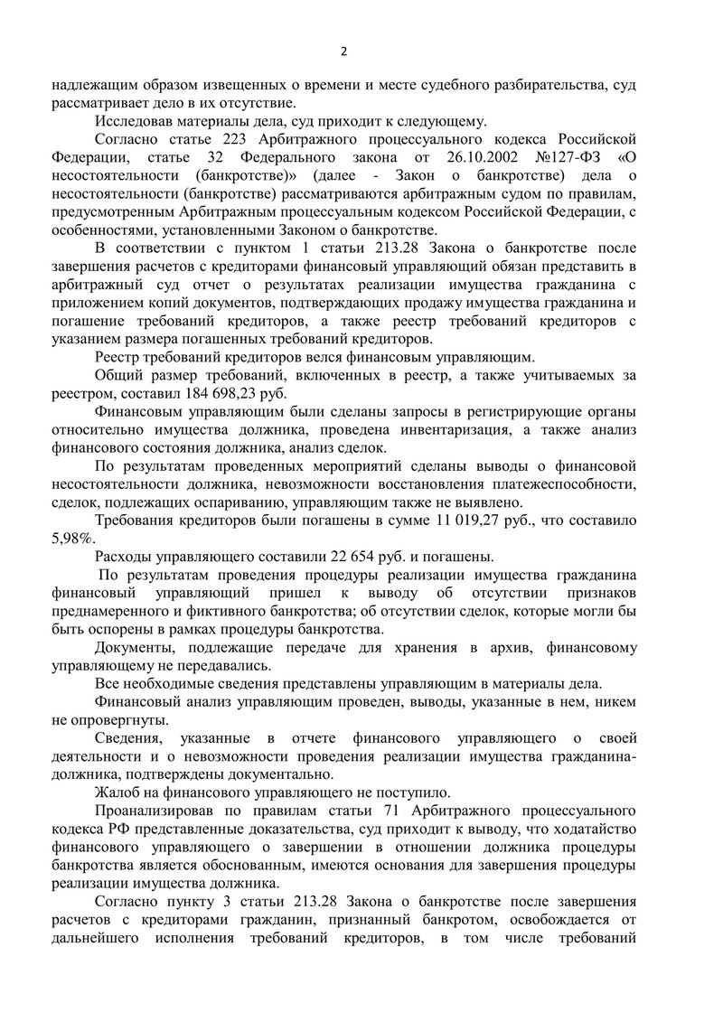 По отчету финансового управляющего часть требований кредиторов удалось погасить: 11 019,27 руб., что составило 5,98%. Расходы управляющего составили 22 654 руб. и были погашены. При этом суд отметил ключевое: конкурсная масса отсутствовала, возможности пополнения — также, а значит, процедура объективно пришла к логическому завершению.