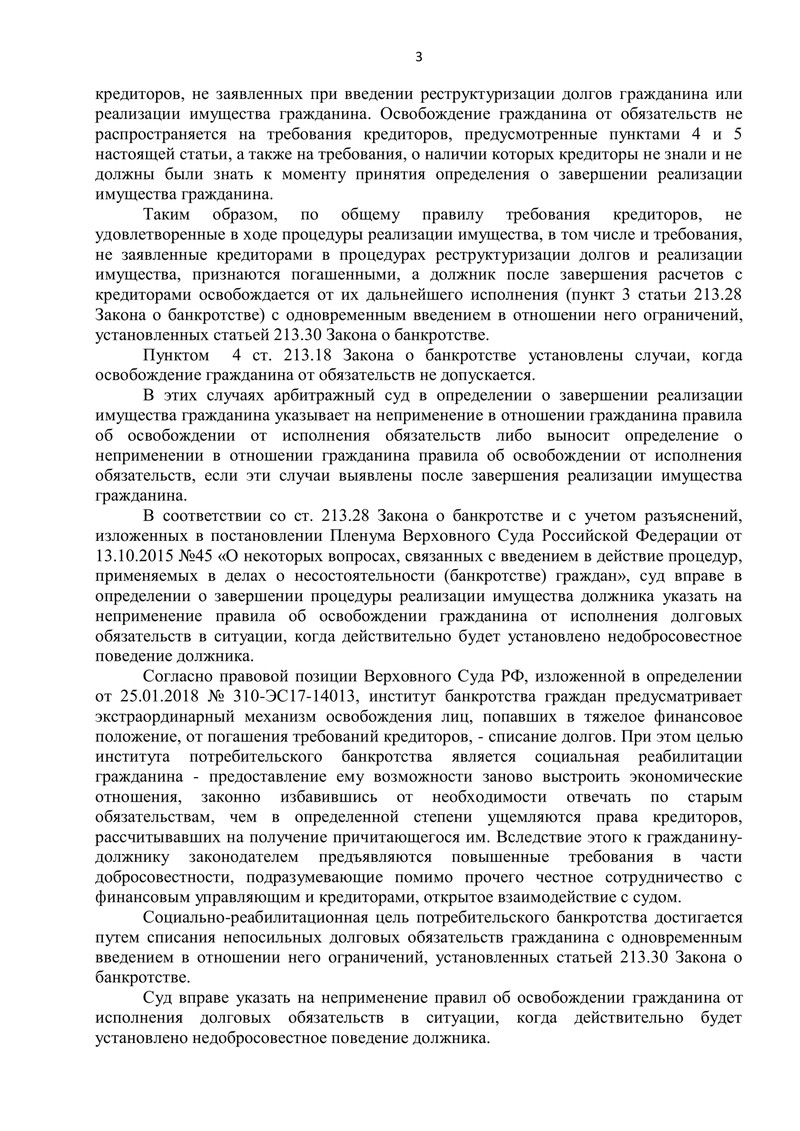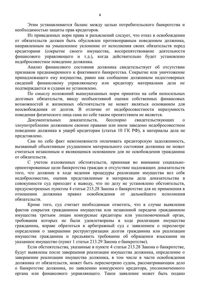 Отдельно важно, что суд подробно оценил вопрос добросовестности. Материалы дела не подтвердили сокрытия имущества, предоставления недостоверных сведений или препятствования работе финансового управляющего. Суд указал: сама по себе невозможность обслуживать задолженность из-за ухудшения материального положения не является нарушением. Поэтому оснований для отказа в освобождении от обязательств (п. 4 ст. 213.28) установлено не было.
