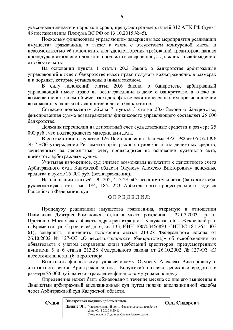 Итог, за которым к нам приходят: суд определил завершить процедуру реализации имущества и применить положения ст. 213.28 об освобождении гражданина от обязательств (за исключением требований, которые по закону не списываются). Также суд определил выплатить финансовому управляющему фиксированное вознаграждение 25 000 руб. с депозита суда.