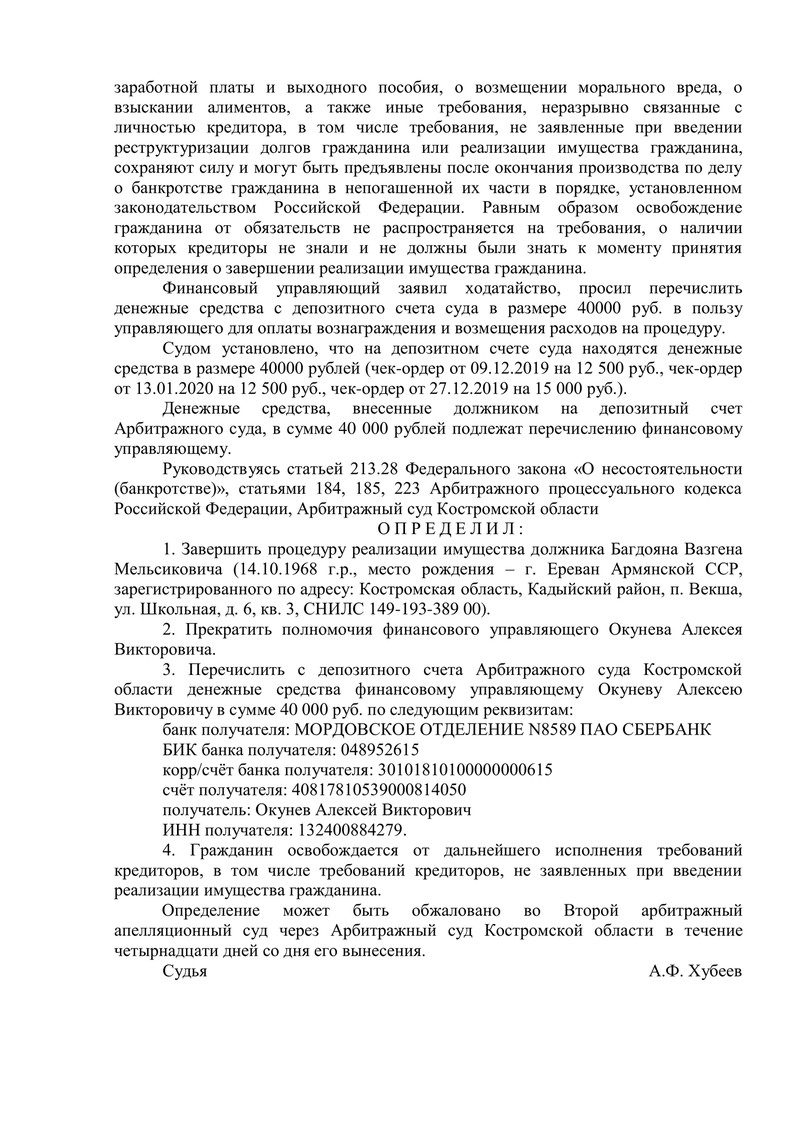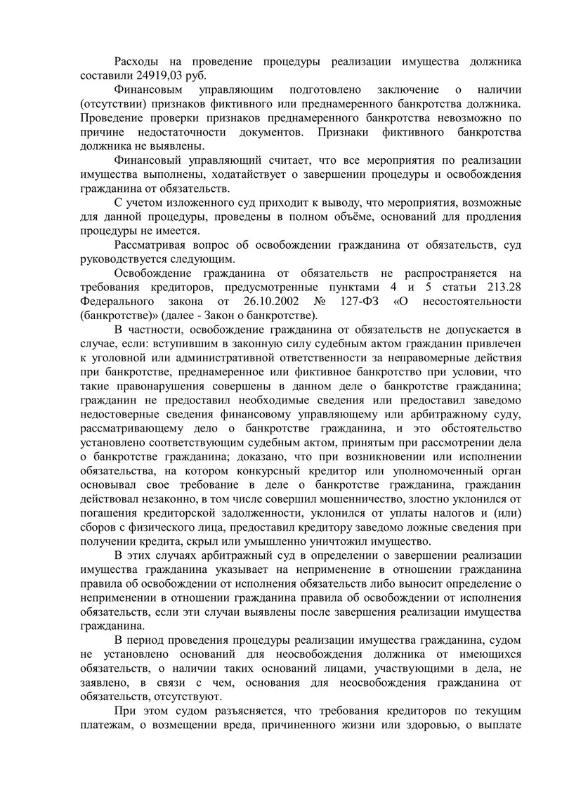 Суд определил завершить процедуру реализации имущества и освободил нашего клиента от дальнейшего исполнения требований кредиторов.