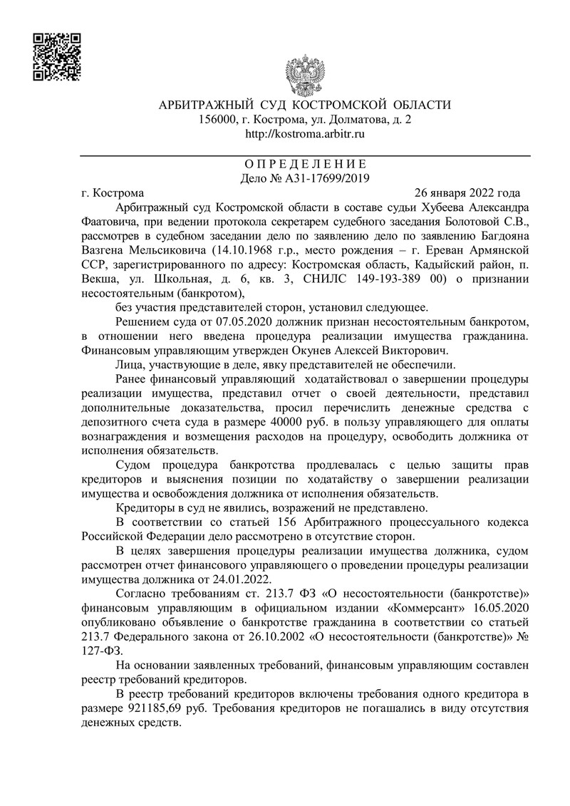 Компания "ДОЛГАМ.НЕТ" продолжает помогать своим клиентам успешно справляться с финансовыми трудностями, и очередным подтверждением этому дело, завершенное в Арбитражном суде Костромской области.