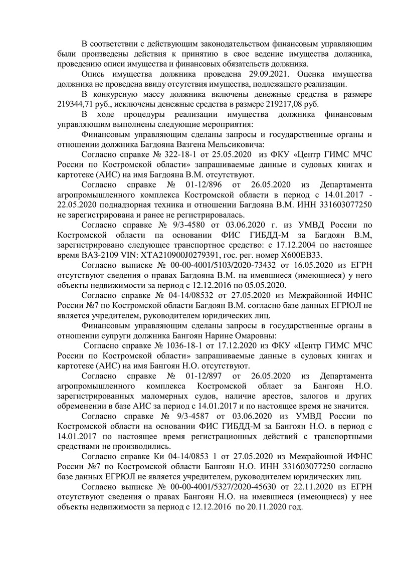 После тщательной проверки и выполнения всех необходимых процедур, таких как опись имущества должника, запросы в государственные органы, выяснилось, что у нашего клиента имеются денежные средства размере 219 344 рублей. За период проведения процедуры не было выявлено признаков преднамеренного или фиктивного банкротства.