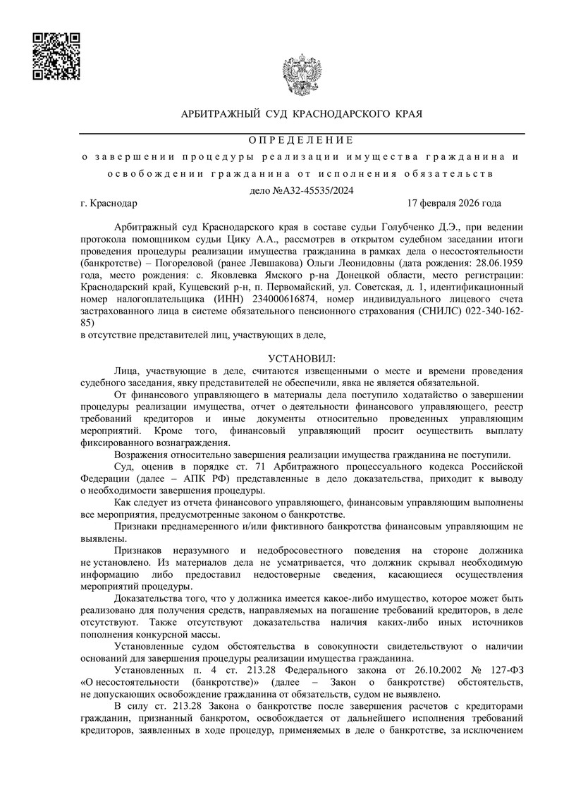 Дело № А32-45535/2024 — еще одна победа ДОЛГАМ.НЕТ в Арбитражном суде Краснодарского края. 17 февраля 2026 года судья Голубченко Д.Э. вынес определение о завершении процедуры реализации имущества гражданина и об освобождении от дальнейшего исполнения обязательств. Для нашего клиента это означает главное: процедура банкротства успешно пройдена, а долговая нагрузка осталась в прошлом.