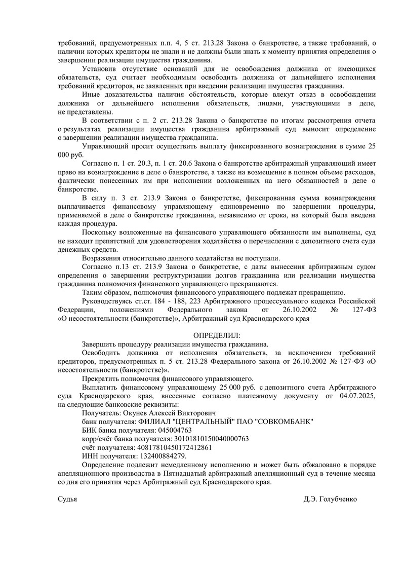 Также суд разрешил организационные вопросы завершения дела: прекратил полномочия финансового управляющего и постановил выплатить ему 25 000 руб. фиксированного вознаграждения с депозитного счета суда (денежные средства были внесены по платежному документу от 04.07.2025). Определение подлежит немедленному исполнению и может быть обжаловано в апелляционном порядке.