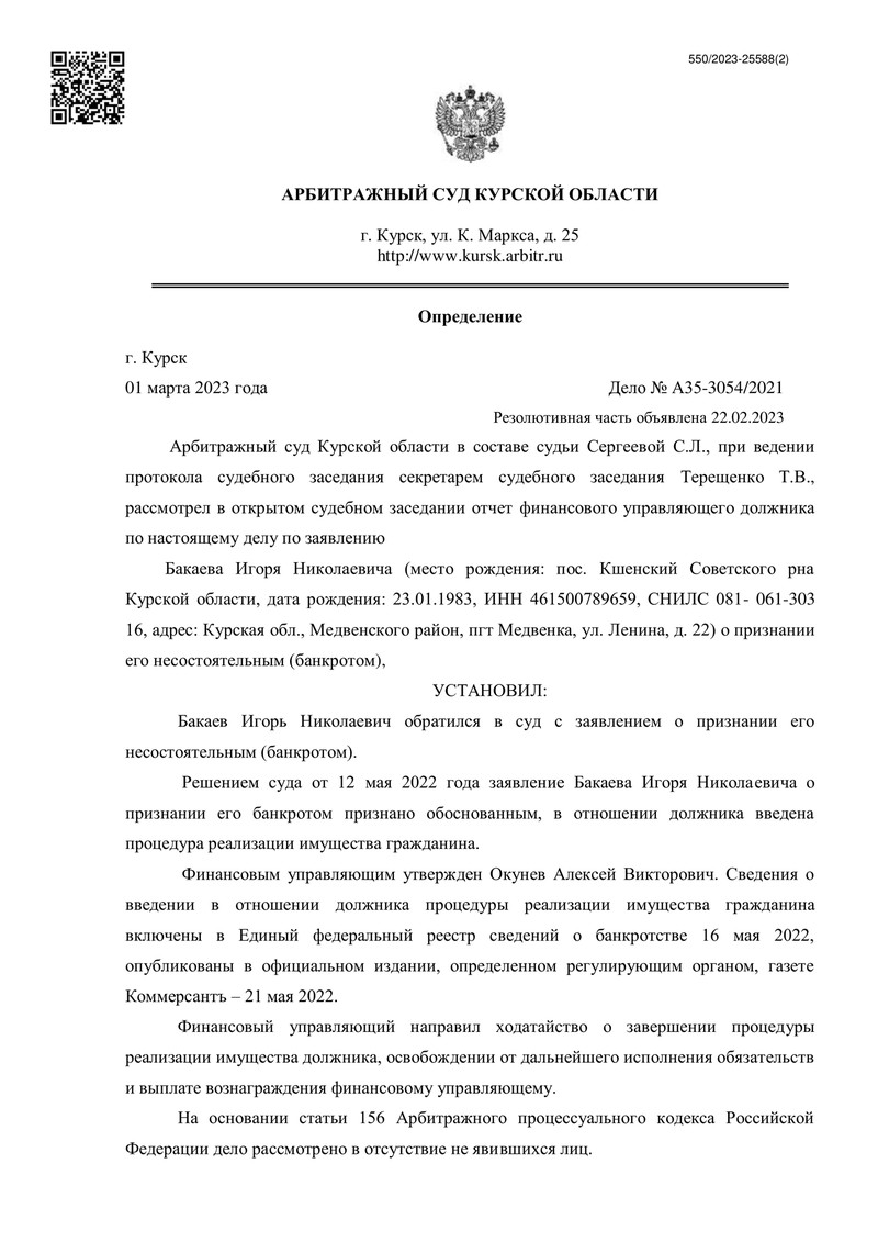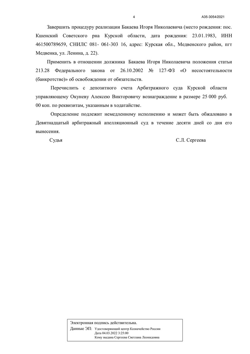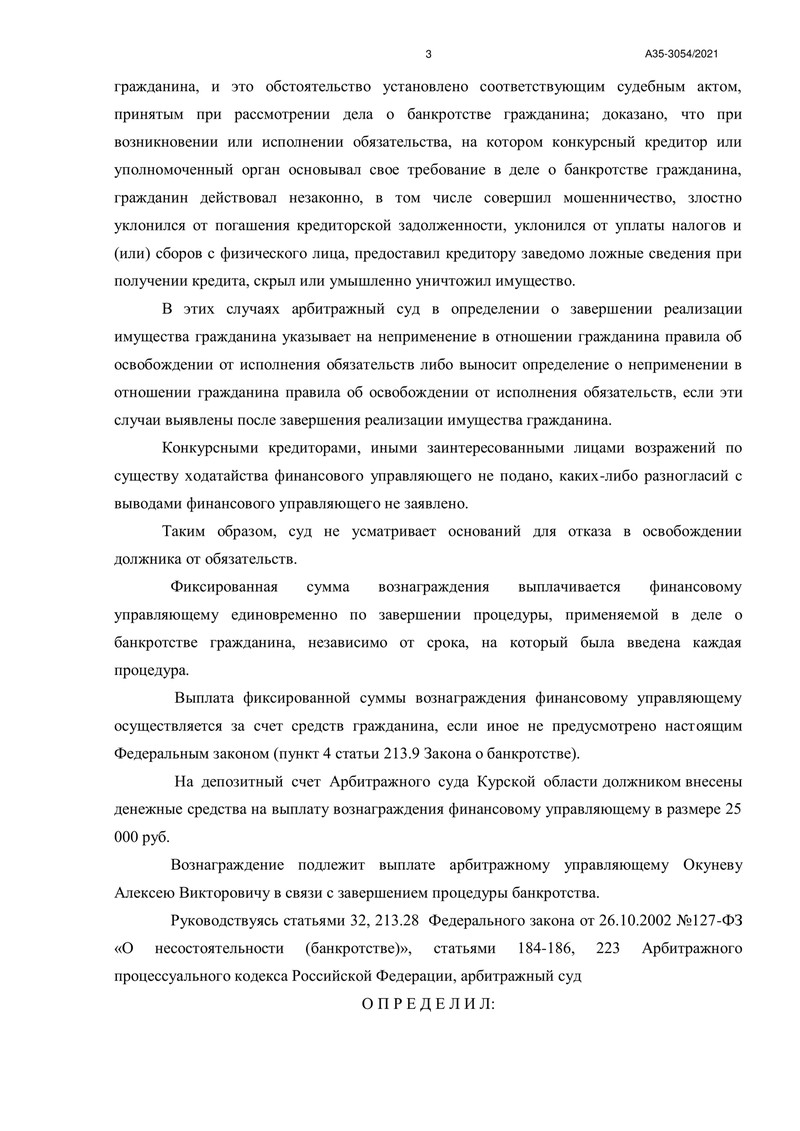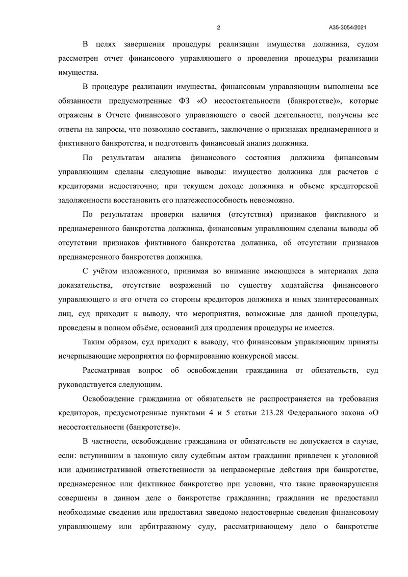 Арбитражный суд Курской области рассмотрел дело №А35-3054/2021. В ходе судебного заседания был рассмотрен отчёт финансового управляющего о процедуре реализации имущества должника. Финансовый управляющий выполнил все необходимые действия для эффективного завершения процедуры.
