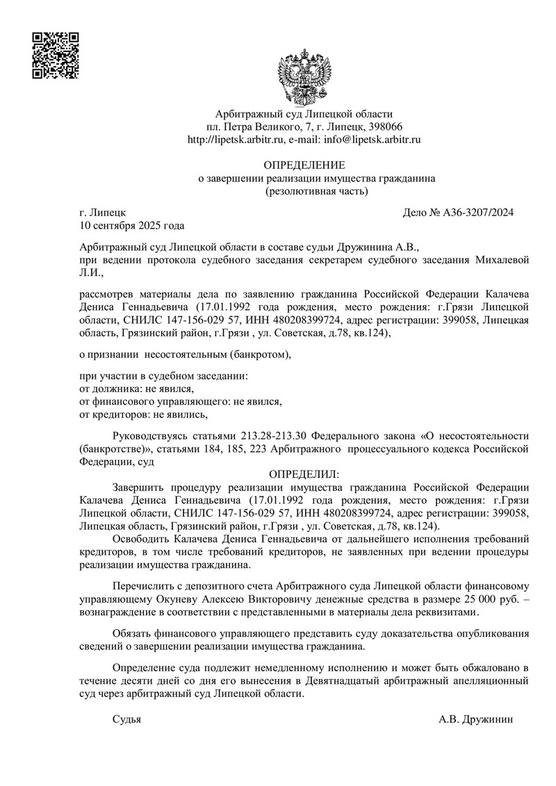 Мы не устаем повторять: даже если кажется, что выхода нет — он существует! Юристы "ДОЛГАМ.НЕТ" берут на себя полное сопровождение процедуры банкротства от первого обращения до финального определения суда, защищают интересы клиента и добиваются освобождения от долговых обязательств любого размера. Арбитражный суд Липецкой области вынес определение на основании подтвержденных фактов и закона — ни одной ошибки или нарушения процедуры!